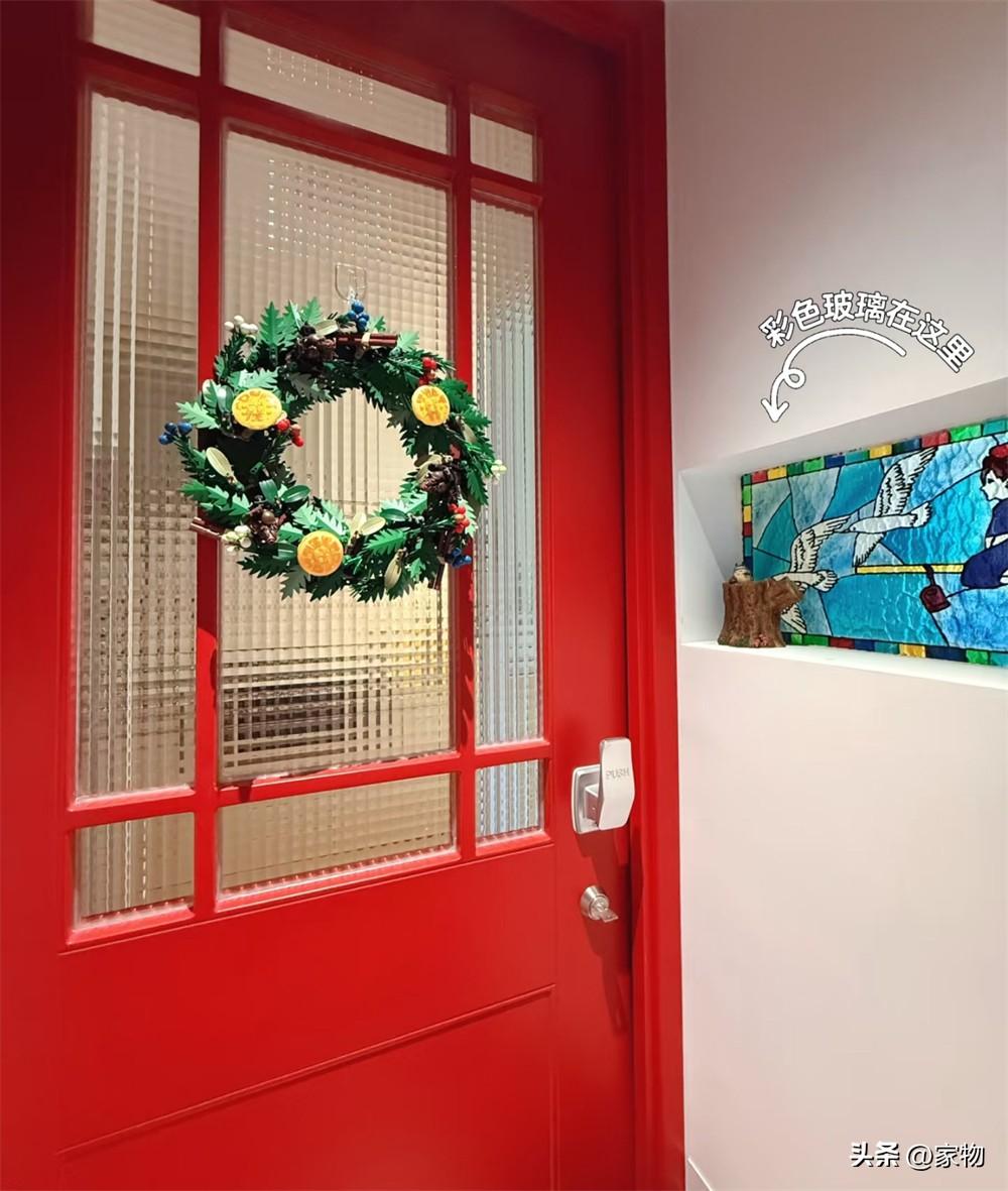 門的另一邊,有一扇半透明的彩繪玻璃鏡,它的後面其實是衛生間,做成半透明的鏡子後不僅爲白牆增添了裝飾,又增加了玄關門廊內的採光,讓這小空間不至於顯得太過昏暗壓抑,好看又實用。