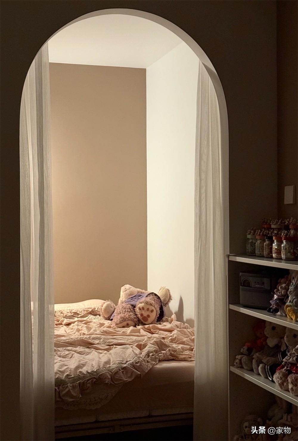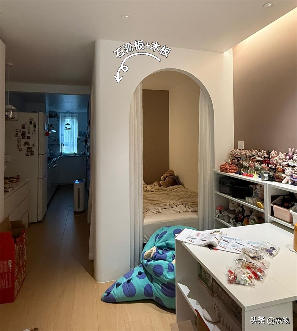 原本的開放空間,現在做出了石膏板和木板作爲拱形門和隔斷,切分出了一間雙人牀大小的臥室,且從牀尾和牀邊都能躺到牀上,動線十分靈活。