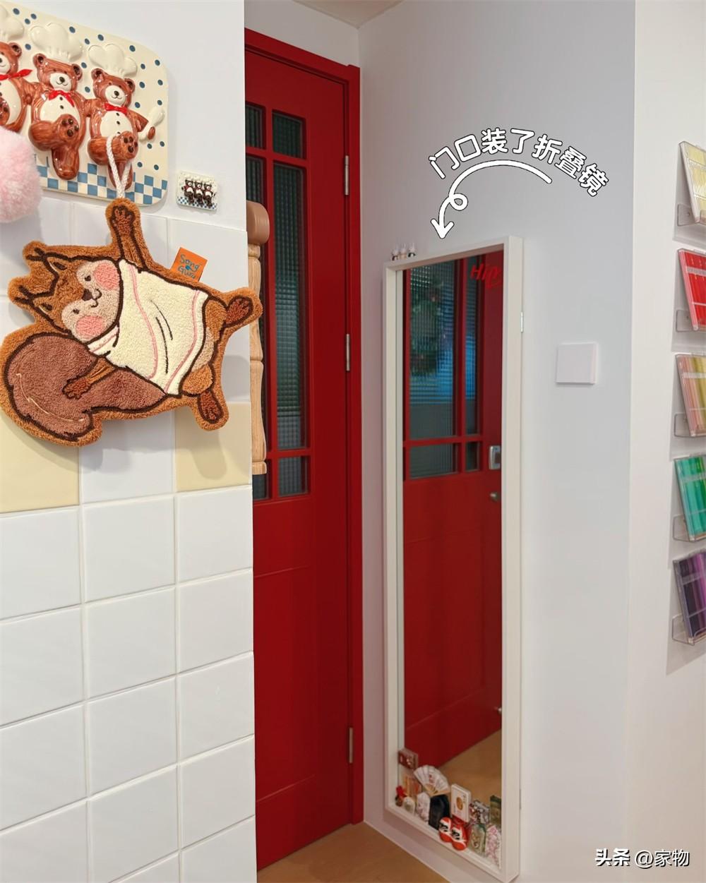 進門有個小小的玄關過度區,她在這裏安裝一扇內門,將玄關鞋櫃隔斷在外,而門內則做摺疊鏡,鏡子帶合頁,打開后里面可以掛些項鍊耳環之類的首飾,因爲鏡子較厚,頂部也可以放些小小的裝飾品。