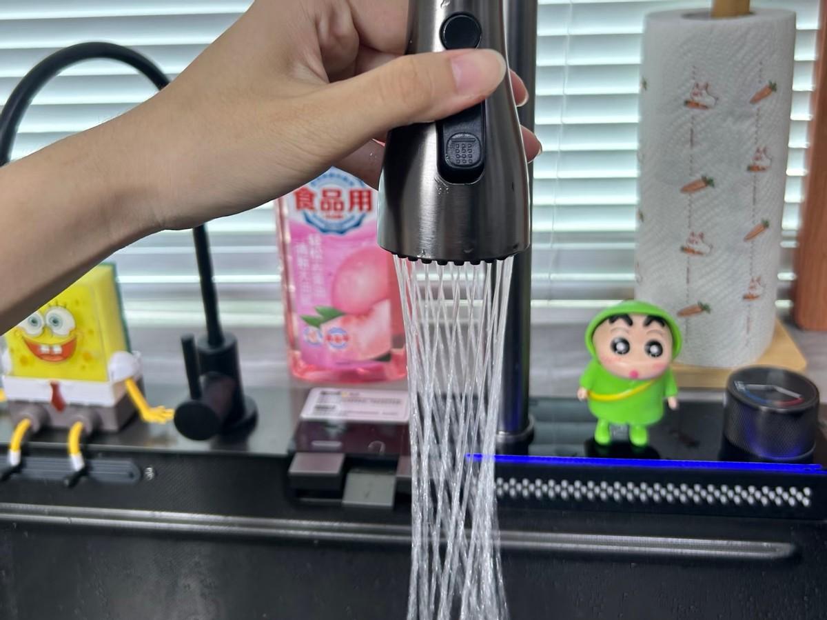 我家這次安裝的是80×50釐米的大尺寸的不鏽鋼單槽,裏面還可以配瀝水槽。另,外搭配的是高拋抽拉式的水龍頭,而且水龍頭可以切換兩種出水模式。