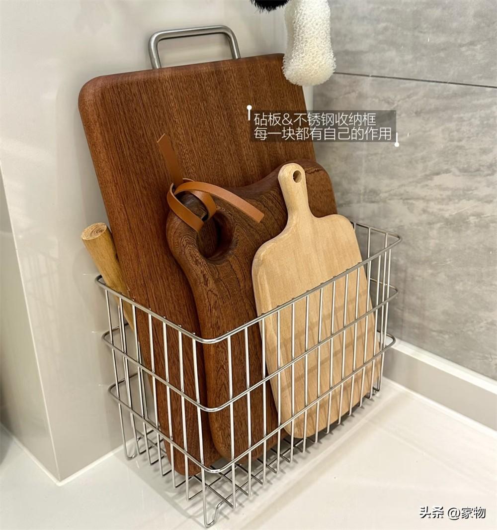 我主要用它來放砧板和擀麪杖等大件物品,別說,放進去以後和木質的砧板還挺搭,直接填補了廚房煙道旁的冗餘空間,好看又好用。
