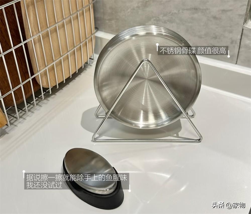 一個三角形支架和一摞不鏽鋼碟子,之前我也推薦過它,真的特別好用,平時無論是放在廚房還是餐桌上,喫飯的時候都可以隨手拿它當餐碟或者是吐骨頭、魚刺的盛裝碟,尺寸大小恰到好處,用起來也很方便。