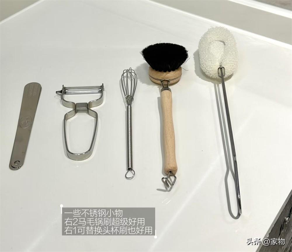 廚房裏的一些其他小東西,我也比較喜歡用不鏽鋼的,其中我最喜歡不鏽鋼削皮刀和杯刷,前者握持手感很舒服,削皮省力;後者可以替換刷頭,刷洗杯子乾淨又順手,還方便清潔。