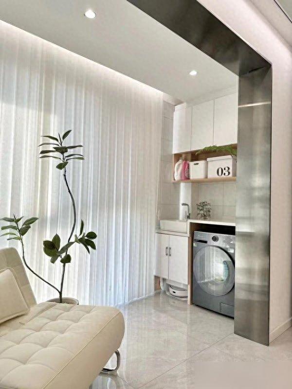 廚房的設計更是小戶型福音:不到3平的空間做U型櫥櫃,牆上裝置物架和掛杆,鍋鏟、調味瓶全掛起來,檯面清爽得能攤開揉麪——是不是很多人廚房小到“轉個身都撞手肘”?人家把空間利用到了每一寸,白色櫥櫃+灰色瓷磚,耐髒又明亮,再也不用面對“廚房像戰場”的崩潰。