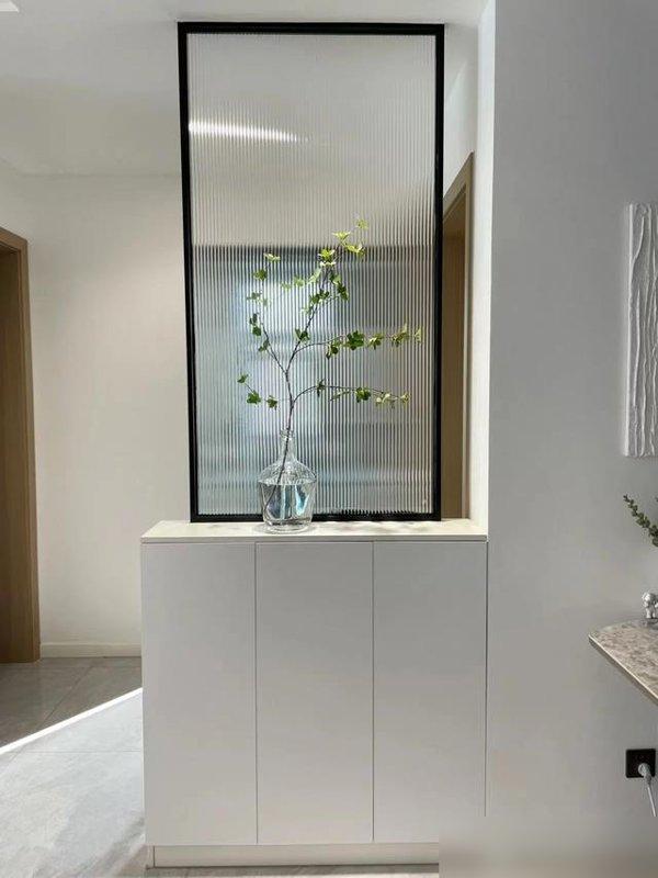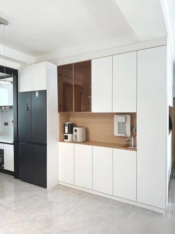 人家用“矮櫃+長虹玻璃門”擋得恰到好處,既遮了風水尷尬,又沒擋光,櫃子還能裝雜七雜八的小物件——誰不想家裏既能裝下雜物又不顯得擁擠?餐邊櫃結合鞋櫃+嵌入冰箱,35cm厚度剛好卡在牆縫裏,中間留空放小家電,吊櫃做玻璃門,既避免了“滿牆櫃子顯壓抑”,又解決了“廚房太小放不下冰箱”的問題,這收納巧思我給滿分!