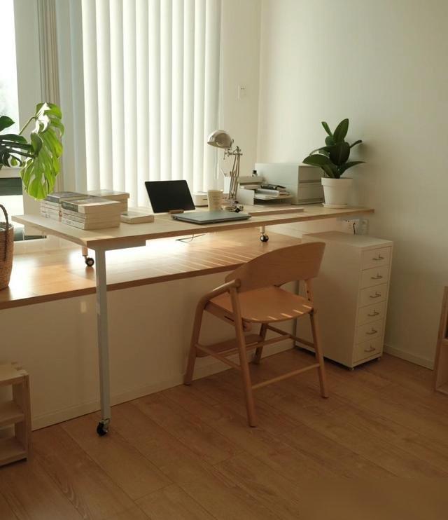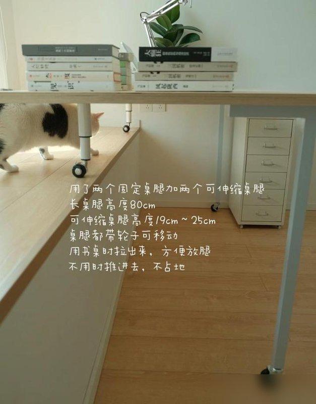 有個網友花580塊做了個可推拉的書桌:飄窗長2.3米,留1.8米做桌子,剩下的空隙用來開窗,桌腿帶輪子,拉出來能放腿,推進去省空間——比那種固定在牆上、擠得腿發麻的小書桌強一百倍!