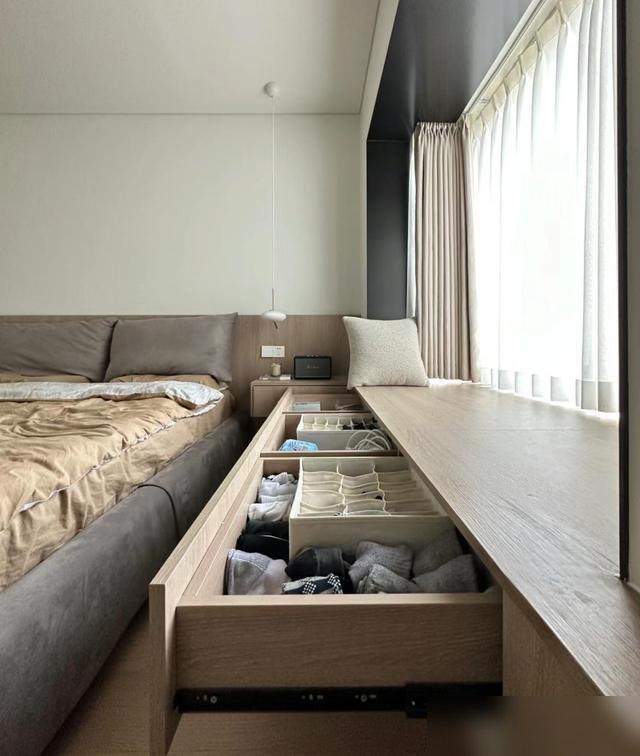 還有收納狂的福音:用飄窗做小貨架裝孩子的衣服、尿不溼,金屬材質沒甲醛,好拿好取;或者加一層抽屜,放臥室的私密小物,早上起牀隨手就能拿護膚品,比翻牀頭櫃方便十倍——我鄰居更誇張,把飄窗抽屜和牀頭櫃做成整體,視覺上跟懸浮櫃似的,既統一又顯大,每次去她家我都想把自己家飄窗拆了重裝!