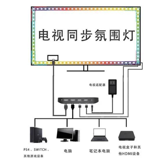 配的時候注意,大部分的聲光同步燈帶是如圖配置的,不能直插電視,有機頂盒,輸出信號經過燈帶,才能做到聲光同步。