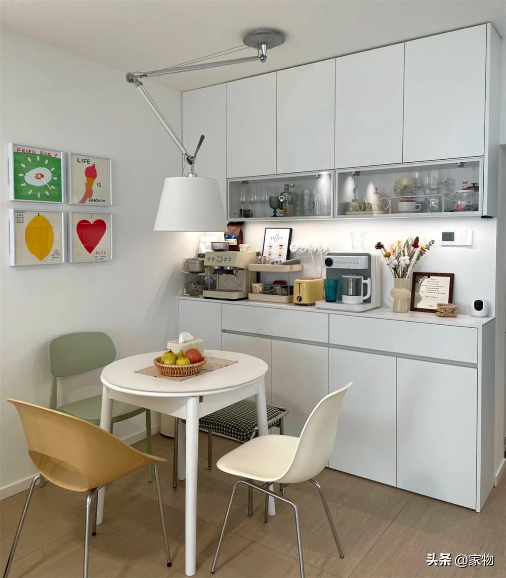餐邊櫃填補白牆,增加檯面水吧區域和額外的碗碟杯盞收納空間,一張小圓桌,搭配四張不同樣式的餐椅,既有特點,又打造出一個最多可供四人同時用餐的區域,一家三口用自然足夠。