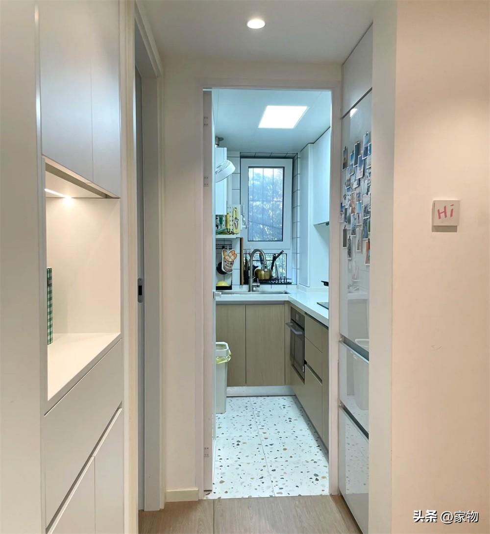 最後再說說家裏的小廚房,它在進門右手邊的位置,是一個狹窄榮昌的空間,甚至兩個人一同進入廚房備菜做飯都會覺得有些擁擠,但好在帶一扇北向窗戶,讓44㎡的小家變得南北通透。