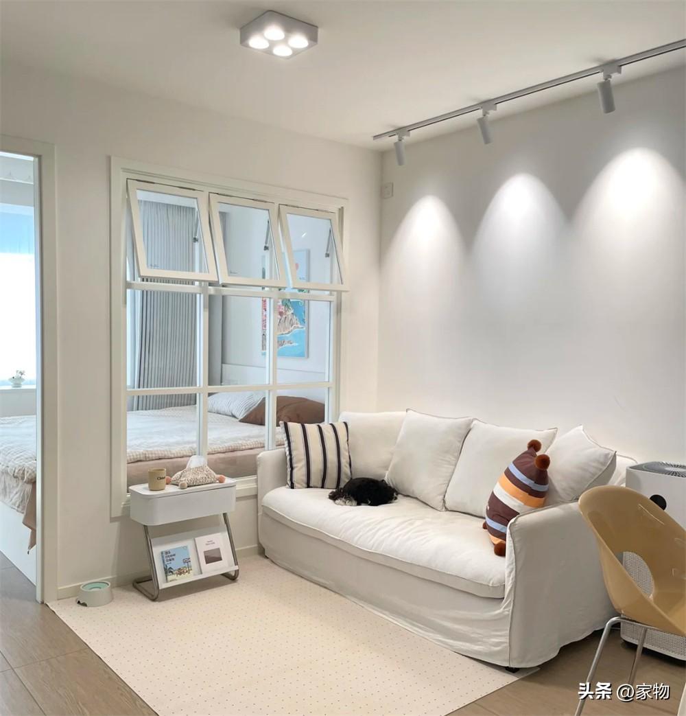 而這次裝修,卻直接將客廳一切爲二,做了一道輕體牆和九宮格的玻璃內窗,隔斷出一間臥室。