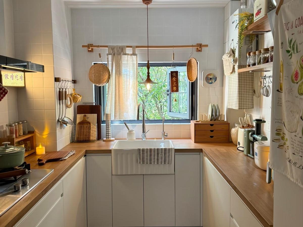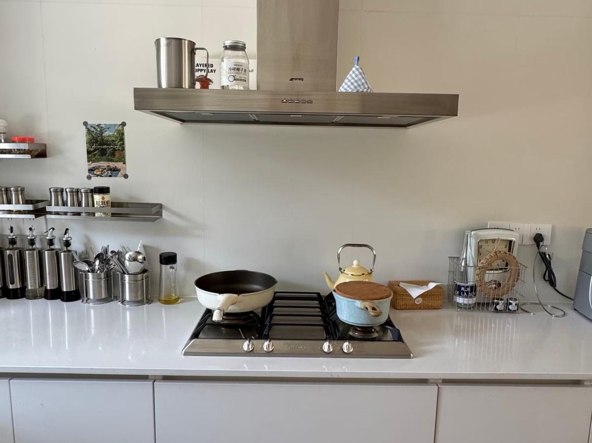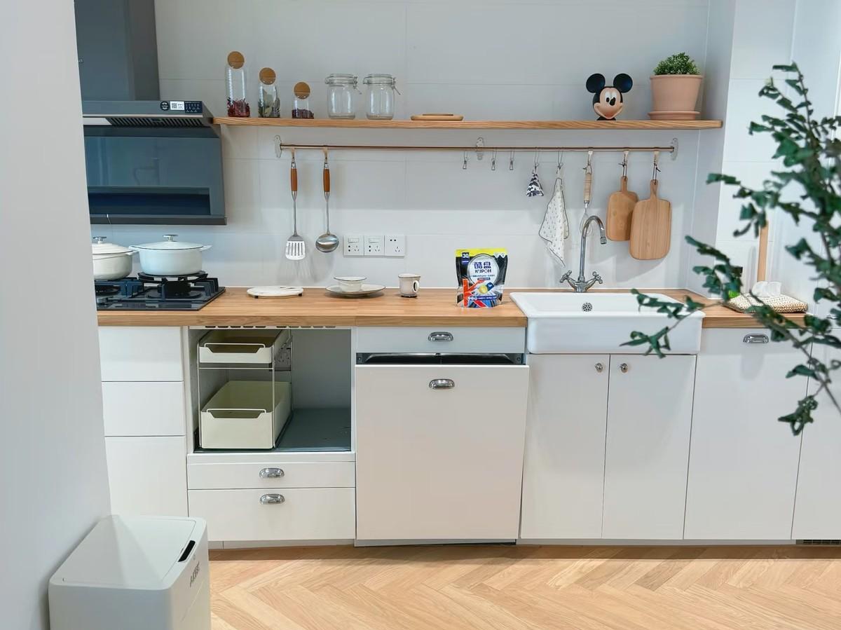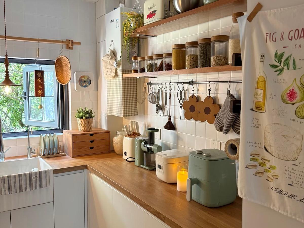 廚房無吊櫃,其實比較適合有儲物空間的家庭。但是,要注意牆面的收納要整齊有序,而且要學會隨手擦,避免落油污。