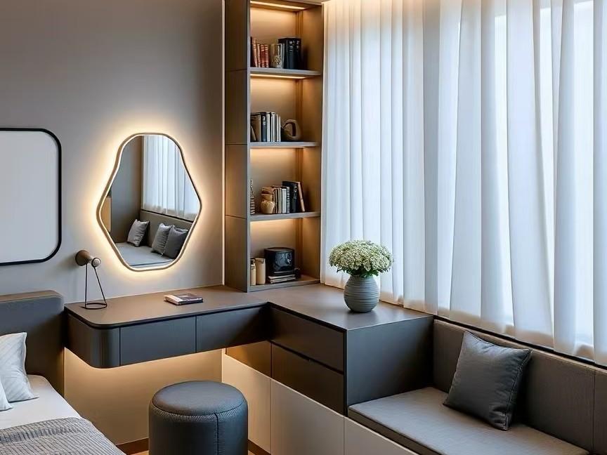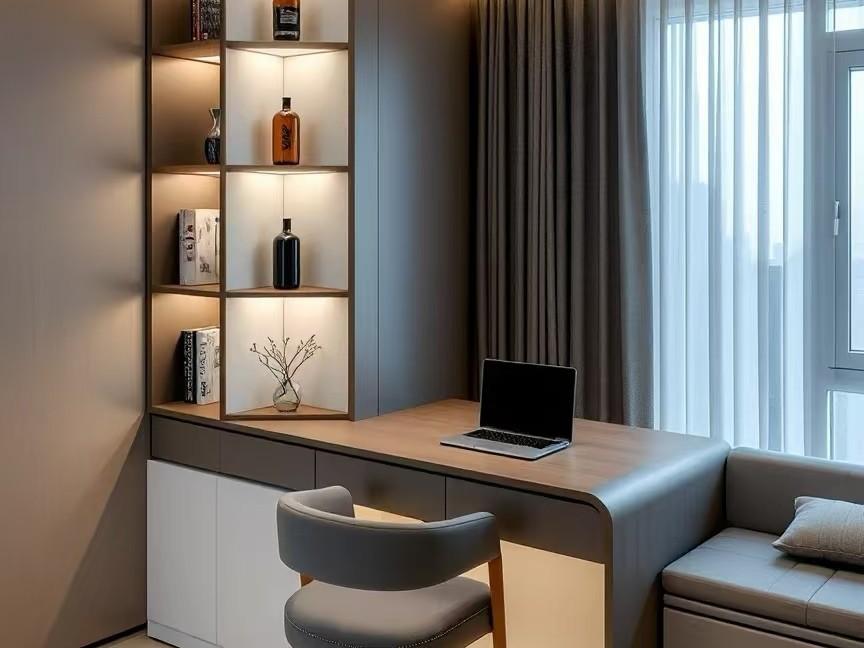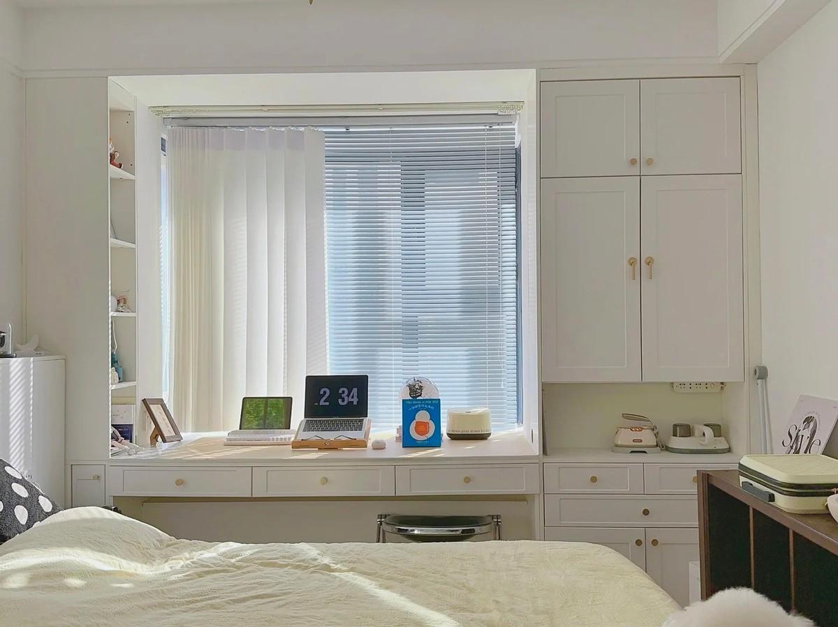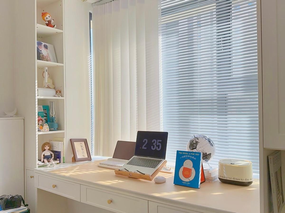 飄窗改書桌,要確保桌面延伸足夠長度,通常要達到60釐米,能夠放腿。而且要配備遮光窗簾,避免陽光的直曬。