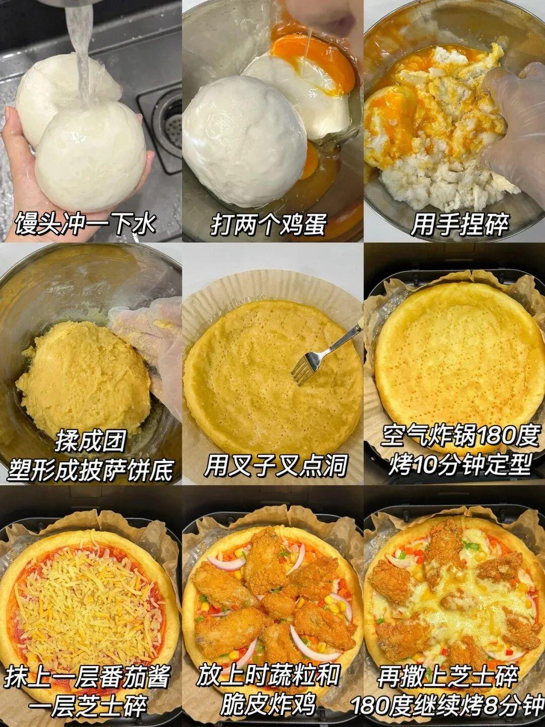 用饅頭當披薩底,配上半成品炸雞,空氣炸鍋一番操作下來,美味自制披薩出爐~