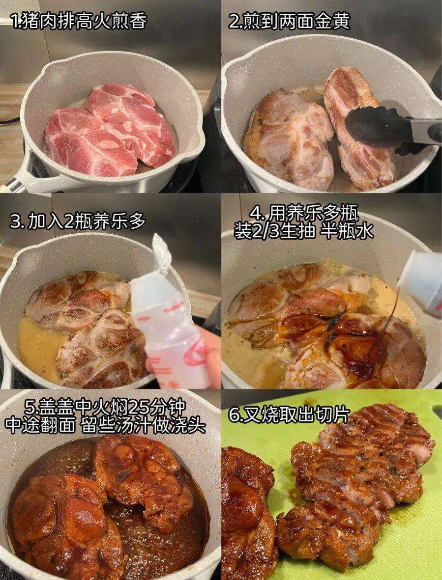 洗淨的梅花肉,不用焯水,直接加入養樂多+水+醬油,比例是1:1:0.7,,沒過豬排,下一步煮好收汁就完事了。