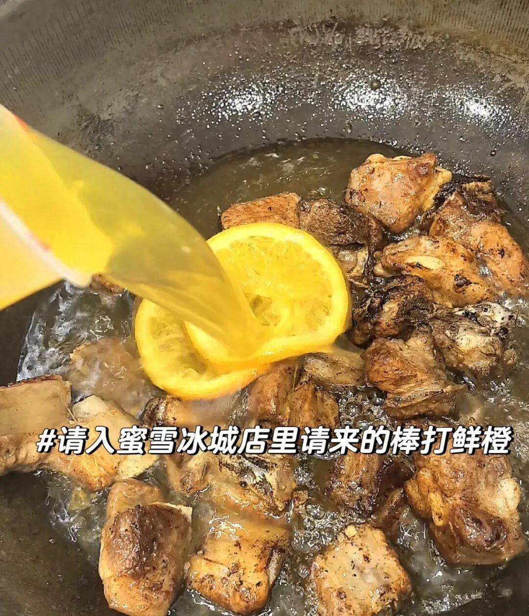排骨焯水去腥,加油炒,加生抽老抽,這是常規操作,不常規的來了,大火收汁不用白水,直接上一杯雪王棒打鮮橙!