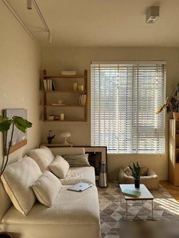 淺卡其像給房間裹層溫溫軟軟的鬆餅胚子,實木地板壓得住底色,倆顏色搭起來,反而比白牆多一層“人味”—你想啊,下班推開門,迎面不是冷冰冰泛着光兒的白,而是暖乎乎像曬過太陽似的鬆餅色,疲憊是不是唰地就褪下去一半?