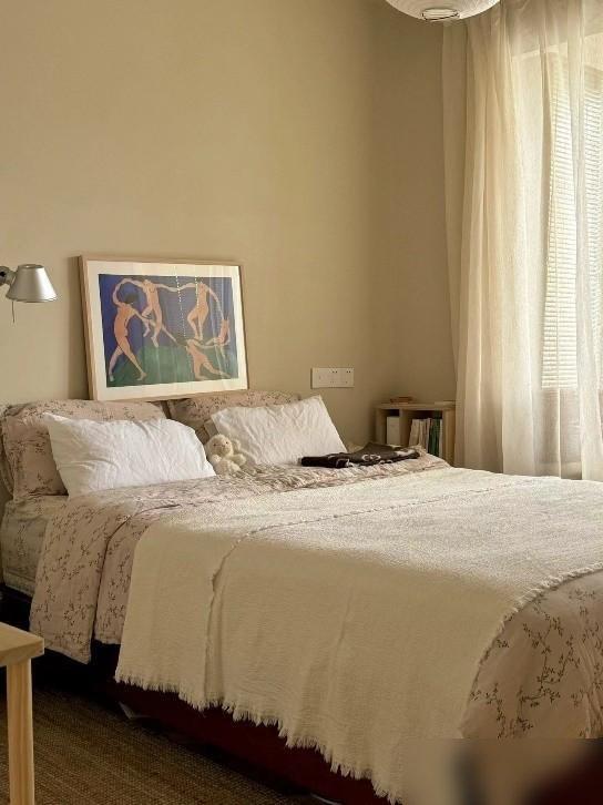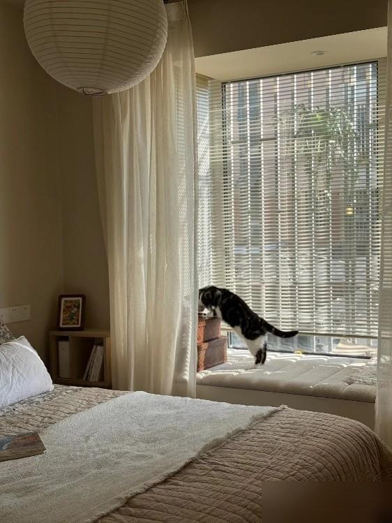 臥室更不用說:駝色乳膠漆刷滿牆(比卡其深一度更暖),球形吊燈光兒柔得像撒層牛奶;大牀配個迷你電視機(週末躺牀上追《甄嬛傳》不要太爽),飄窗墊鋪奶白色毛絨款—閒下來蜷這兒翻本書,看貓扒着窗戶沿兒追麻雀,心瞬間軟成棉花糖~