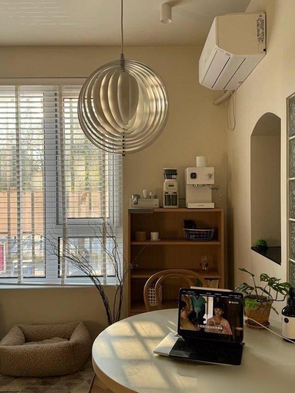 投影投牆上,想看電影拉上百葉簾就是私人影院;櫃子上層擺咖啡機和玻璃杯—閒下來磨杯手衝,窩沙發上看《老友記》,這不比擠在茶几前扒着小電視舒服?