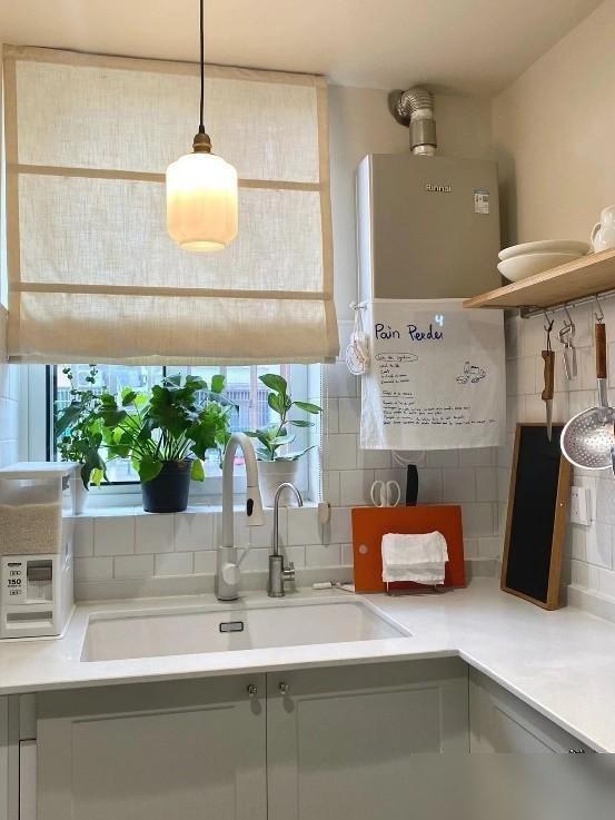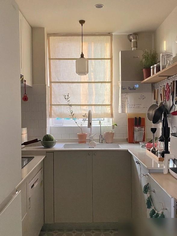 U型佈局更是把每寸牆面榨乾:切菜區高1米(不用彎腰弓背痠半天),炒菜區低80釐米(顛鍋胳膊不累),牆上釘倆置物架掛鍋鏟漏勺—檯面永遠空空蕩蕩,再也不會找個鹽罐翻三分鐘!
