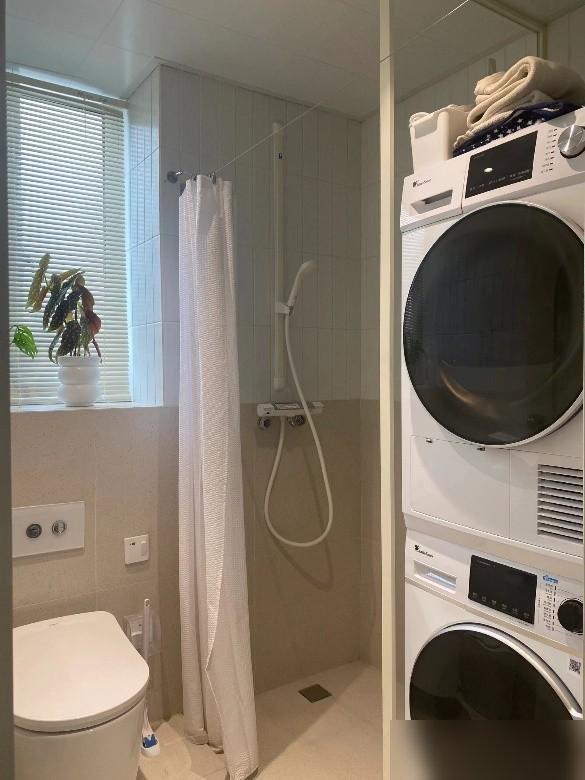 (擦地直接拖過去,沒有藏污納垢縫兒)洗衣機烘乾機塞進裏頭!