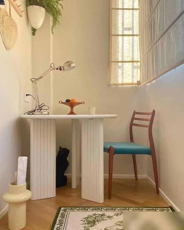 平時收起來貼緊牆,留出的空地兒既能當瑜伽墊地盤兒(週末早起抻抻腿),也能偶爾拉出來湊四人位(朋友來聚喫火鍋);沒裝死沉的固定櫥櫃—留空太重要了!