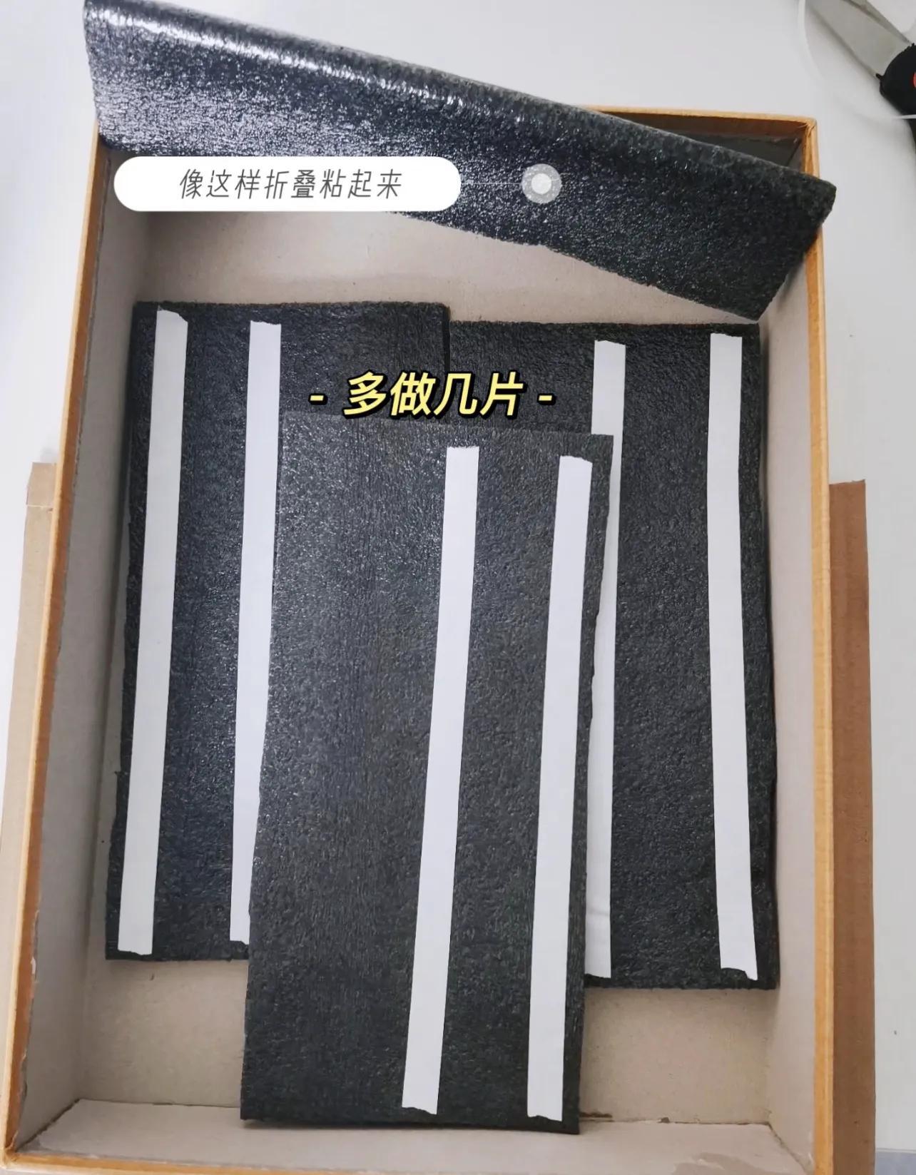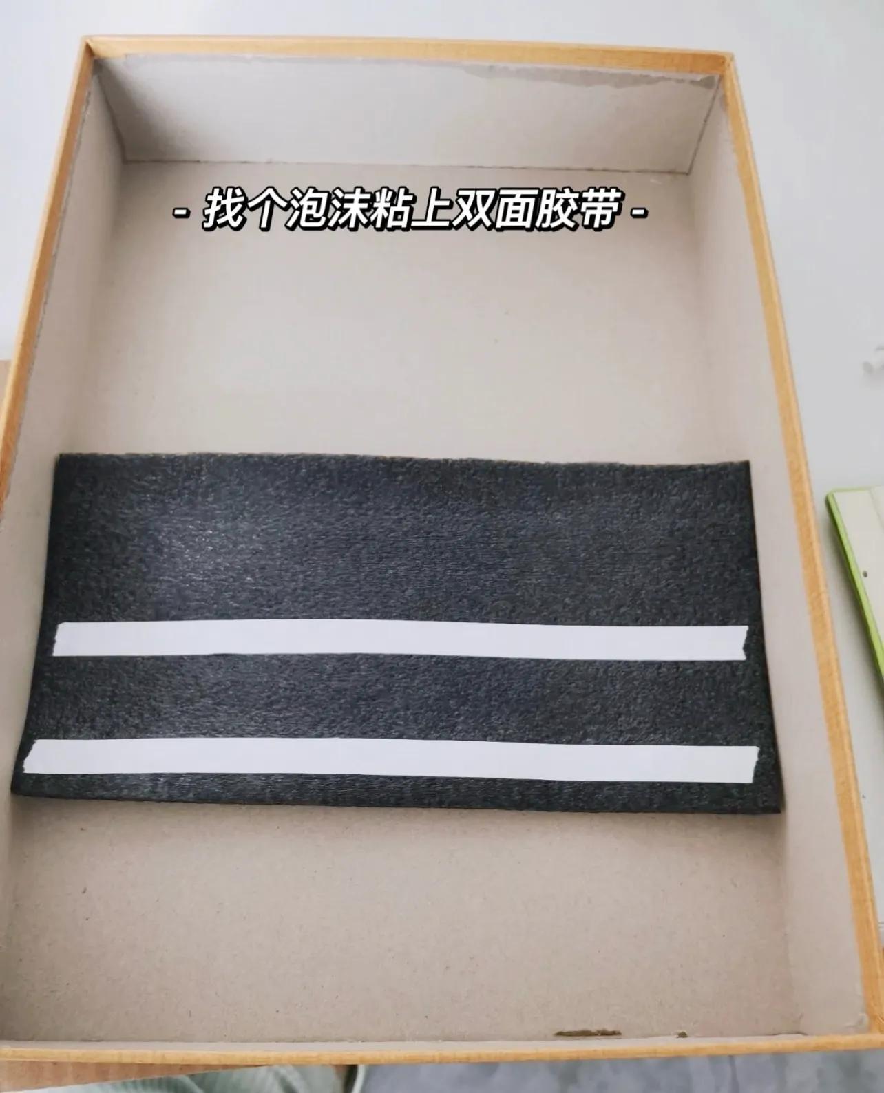 1)將泡沫紙和絨布裁剪成相同大小、和月餅盒內層同等寬度的長方形片。然後給給泡沫紙貼好雙面膠。