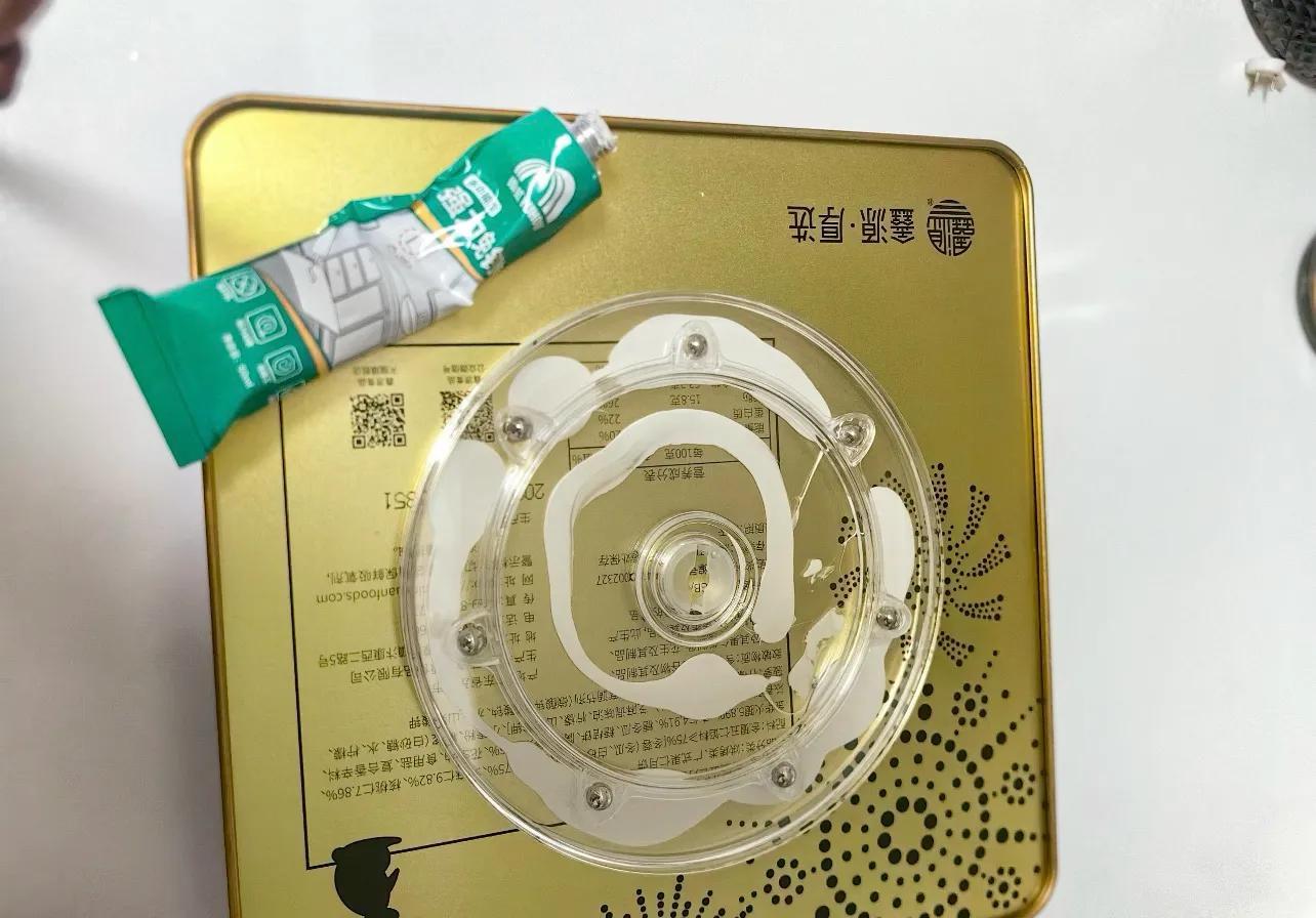 然後,用強力膠將轉盤黏在月餅盒底。