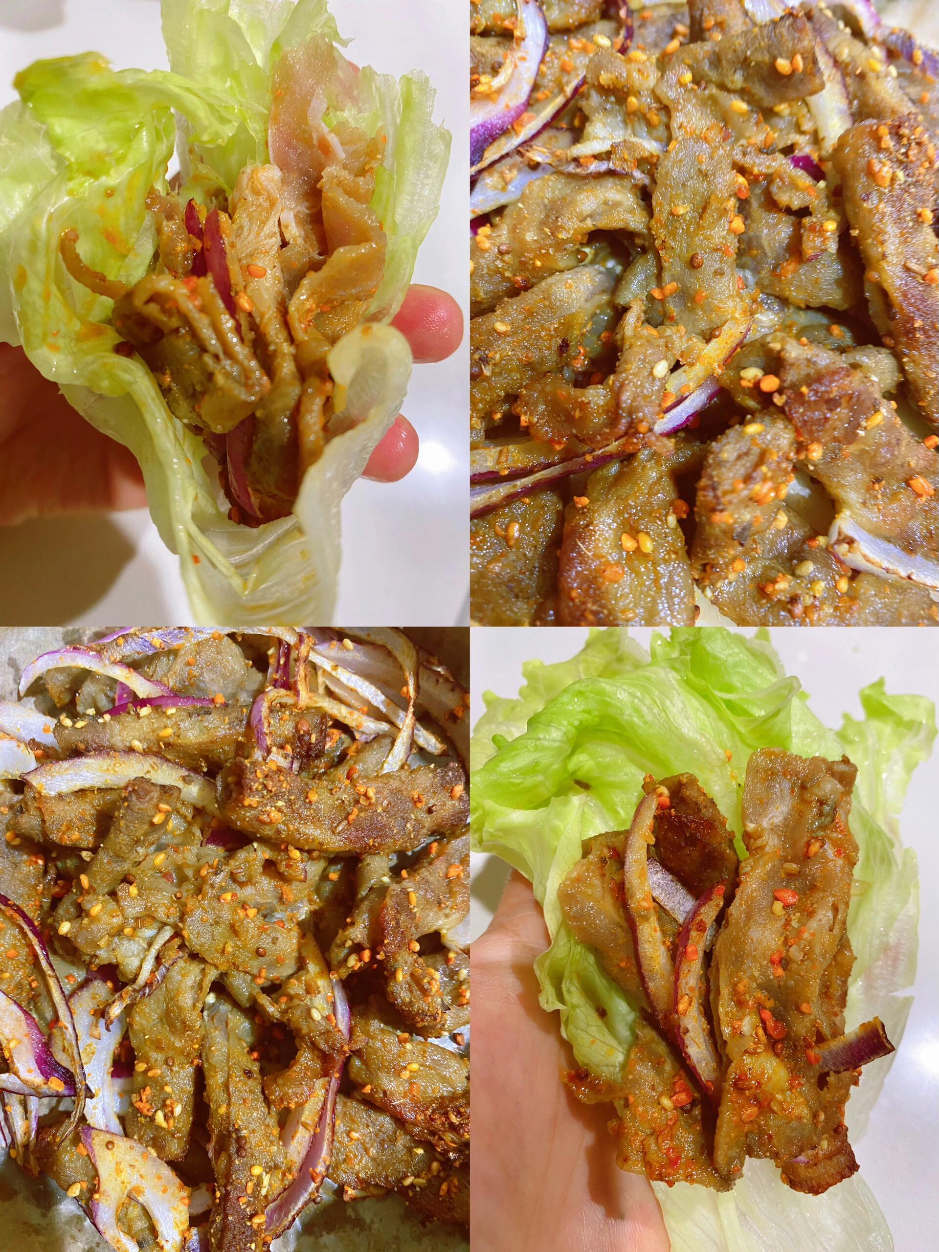 1.準備好肥牛片、洋蔥、生菜、燒烤料;