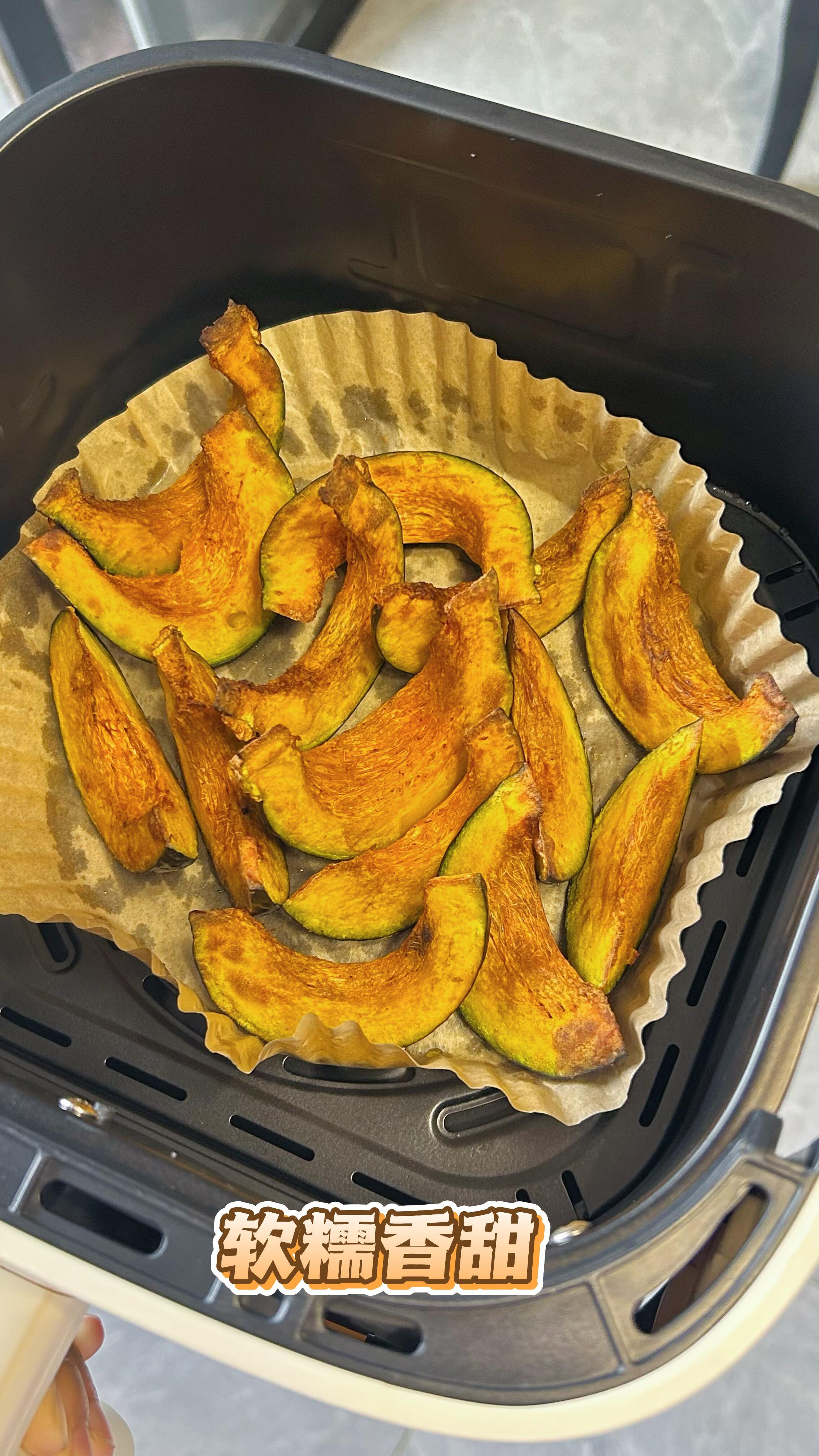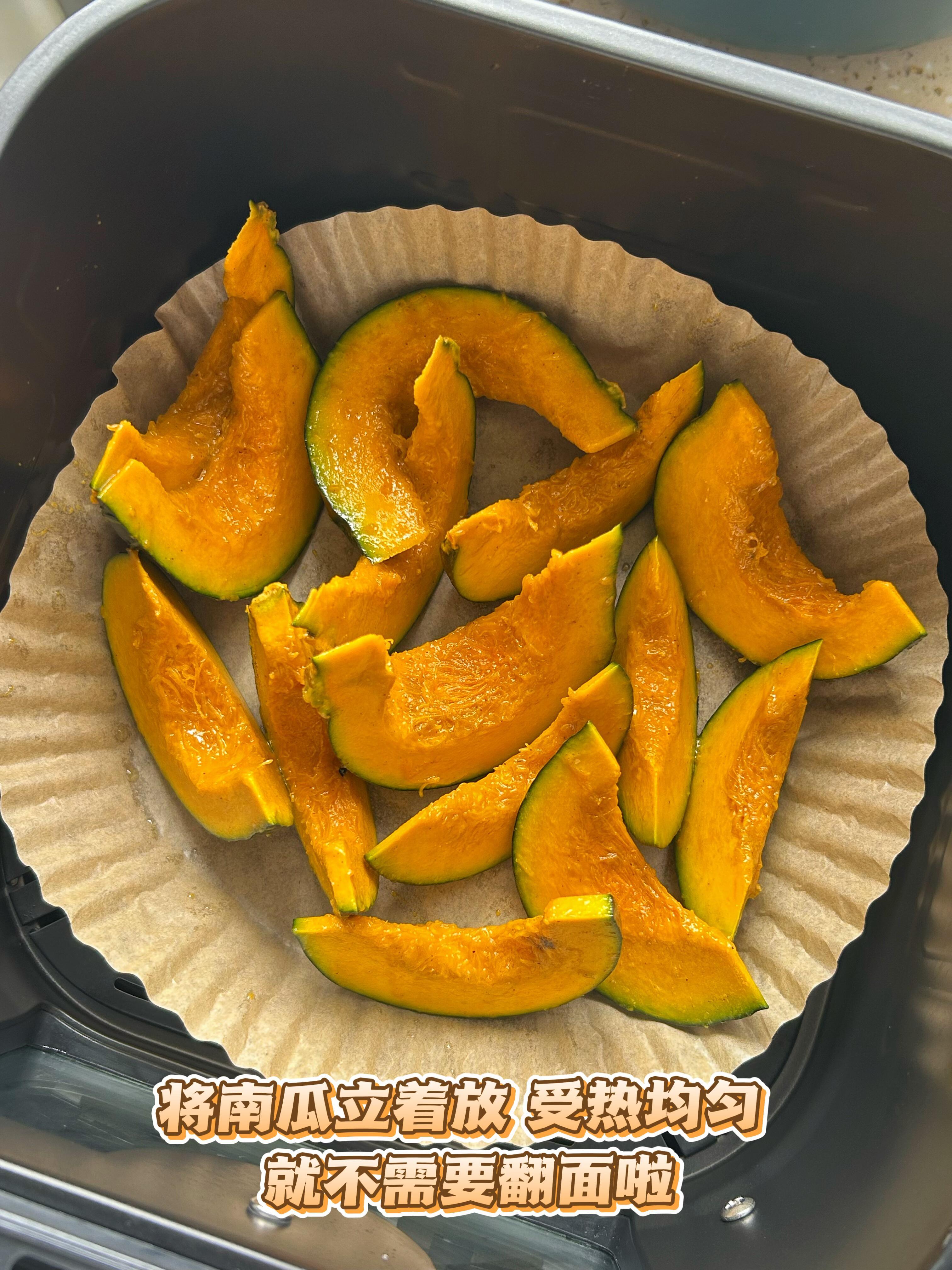 3.南瓜條立着擺放在空氣炸鍋裏,設置180℃20分鐘即可。