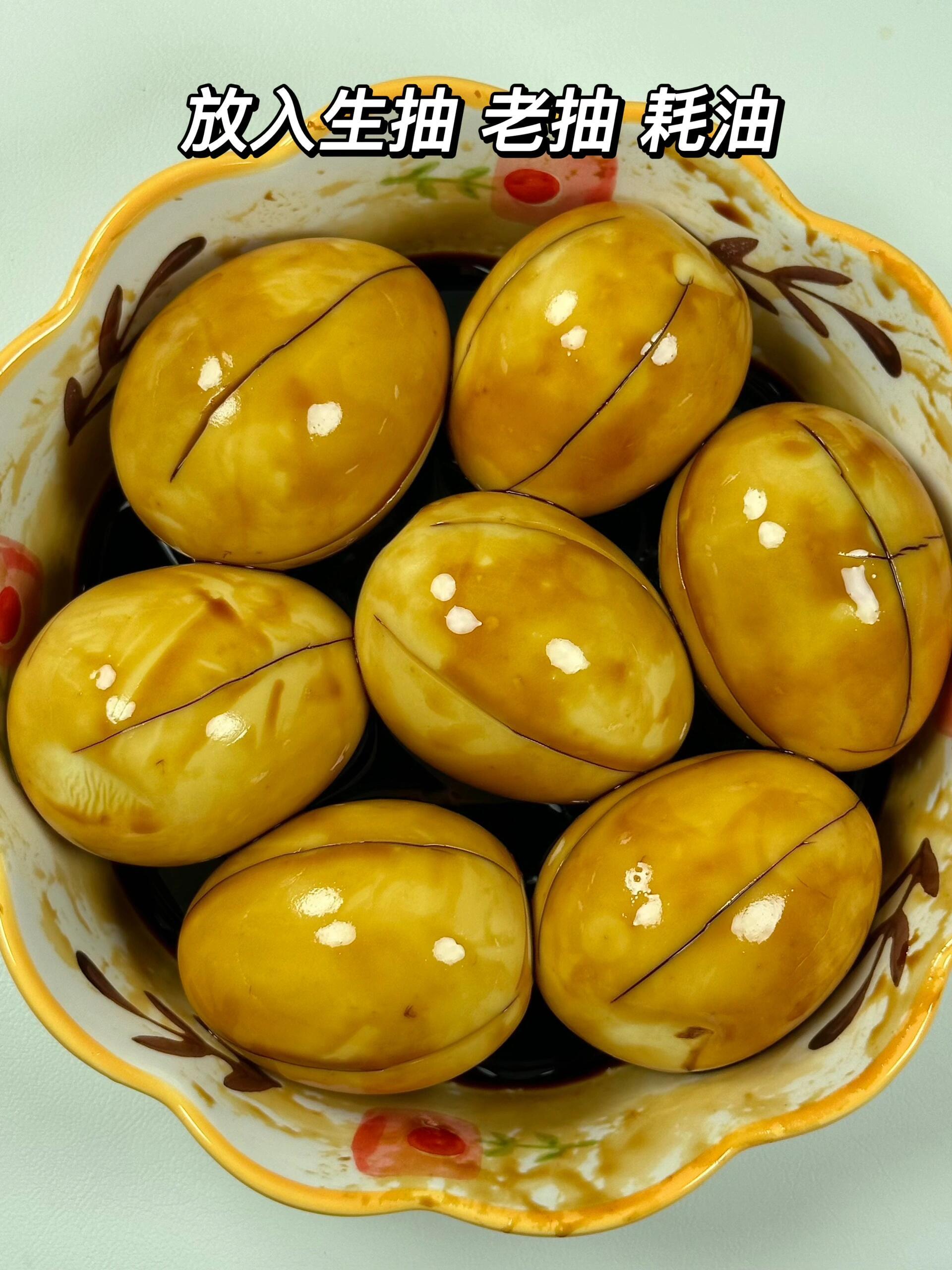1.雞蛋煮熟過涼水去殼,雞蛋四面各切一刀,碗中放入雞蛋+生抽+老抽+蠔油;(這一步可以醃製一會哈,這樣雞蛋會更入味)
