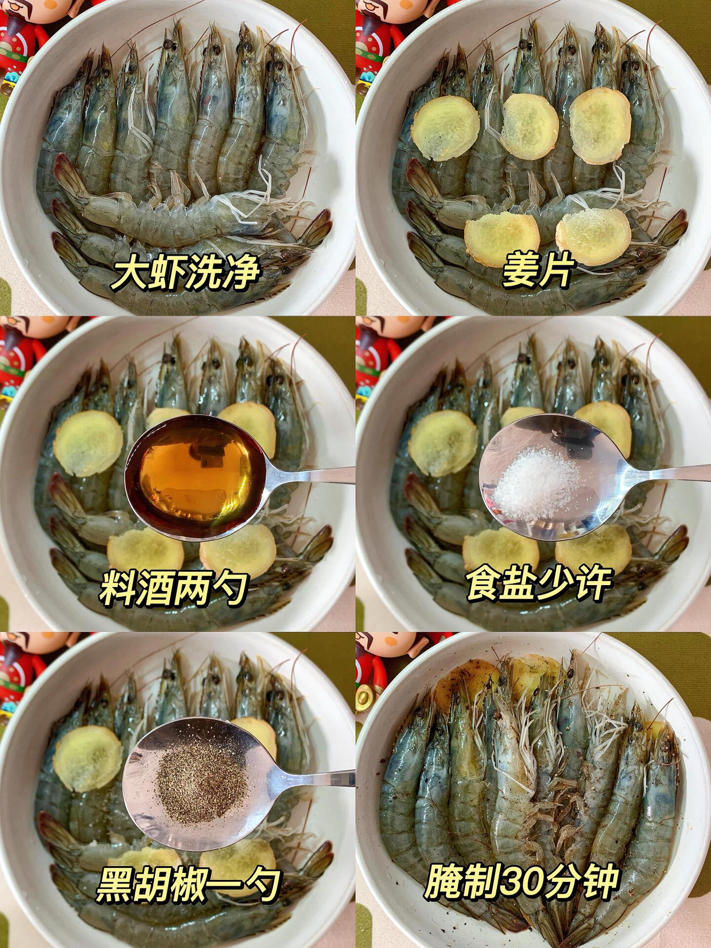 1.大蝦洗淨放碗裏,加薑片、兩勺料酒、少許鹽、黑胡椒粉一勺,醃製30分鐘;