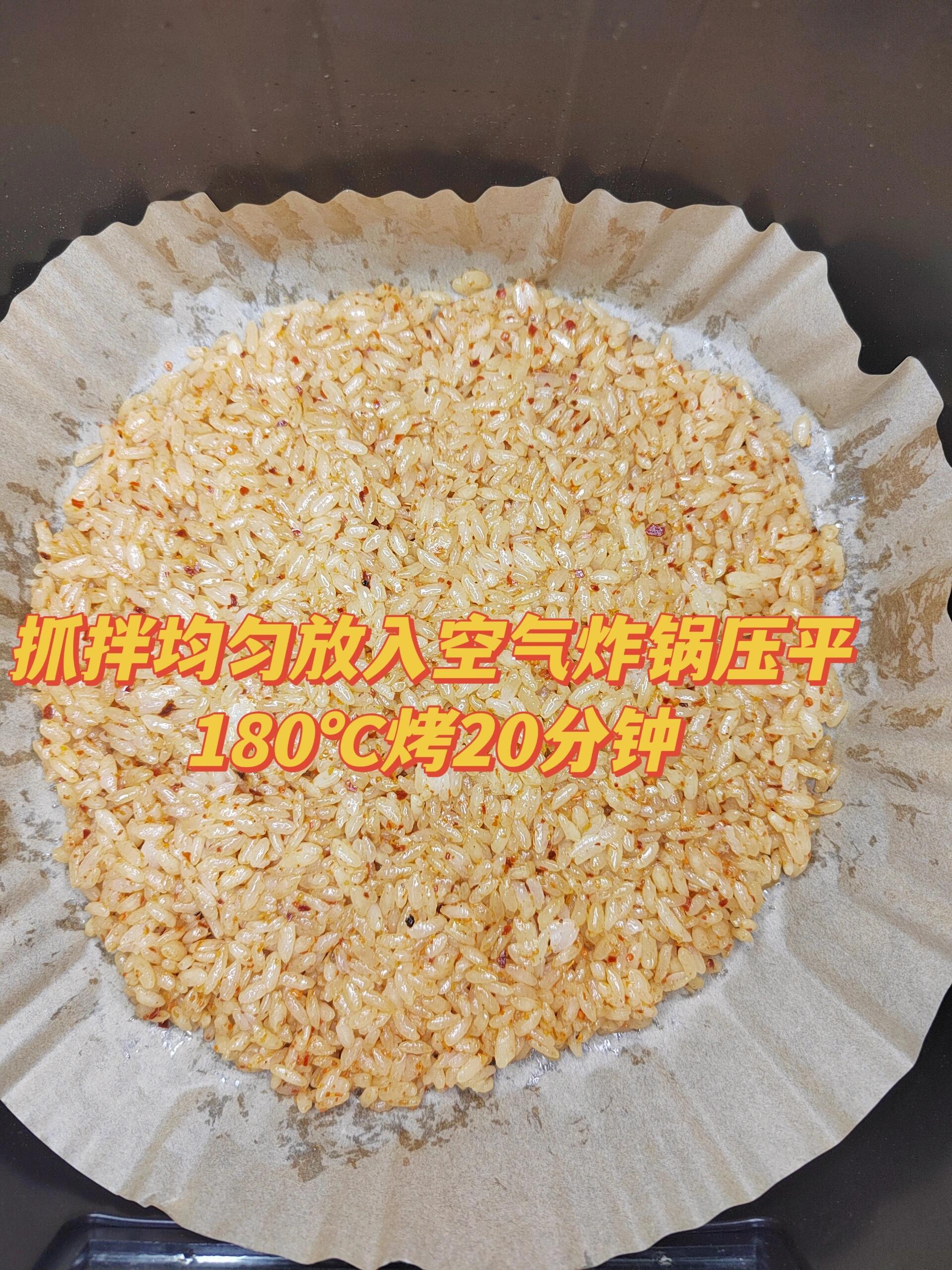3.攪拌好的大米飯,平鋪在空氣炸鍋的油紙上;