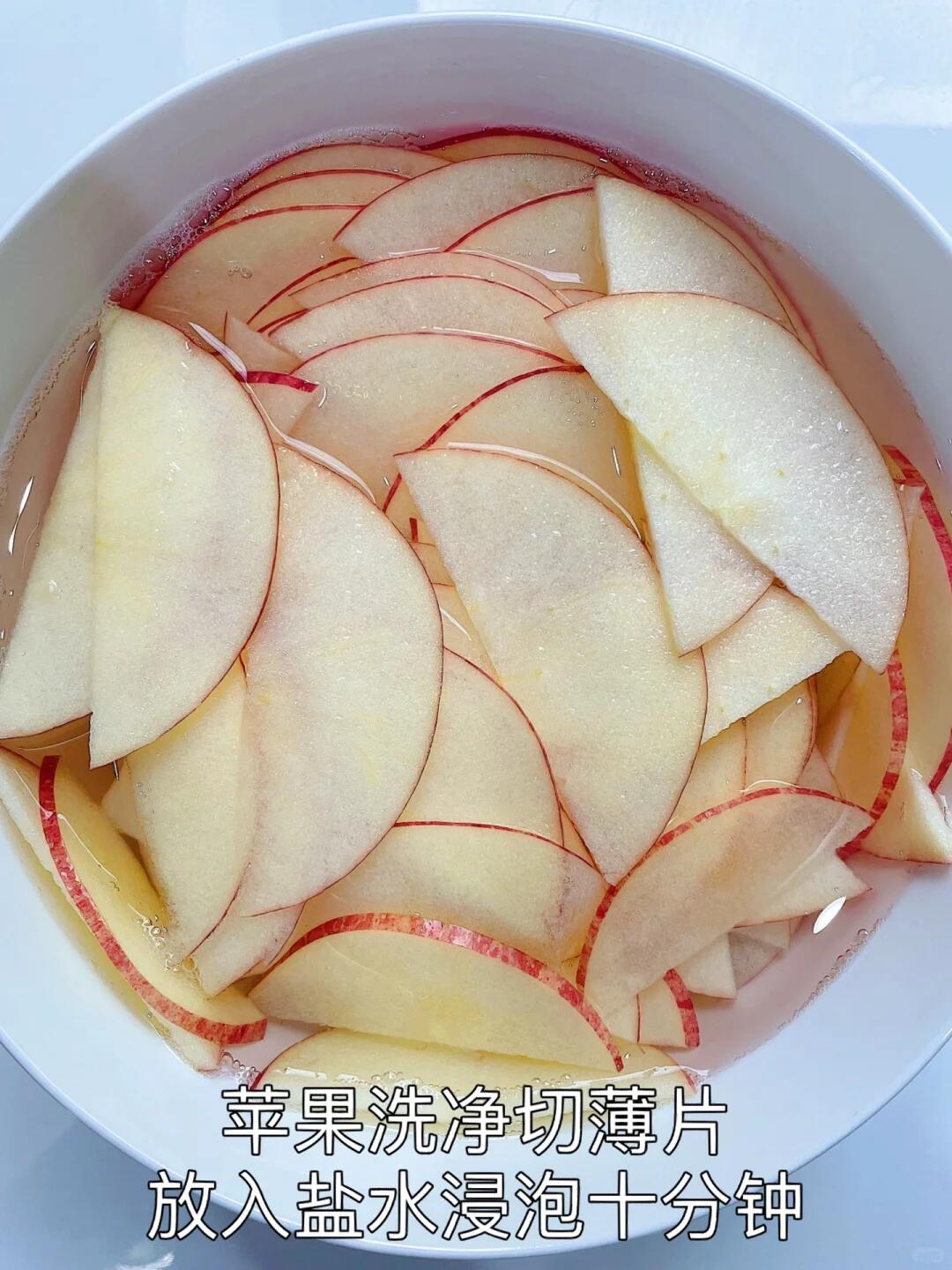 1.蘋果洗乾淨,切薄片,鹽水浸泡10分鐘;