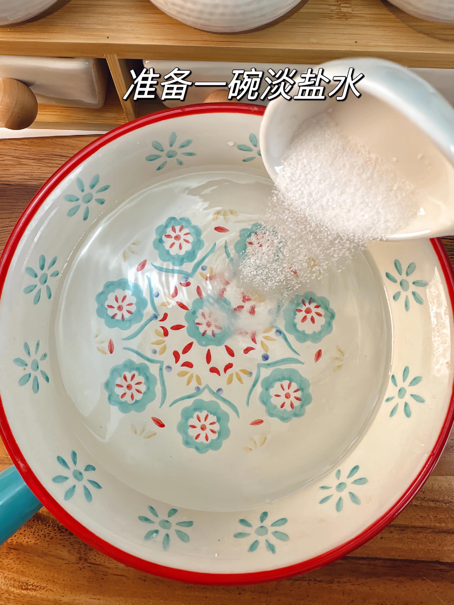 1.大饅頭切片,準備一碗水,加點食鹽,饅頭片浸一下;