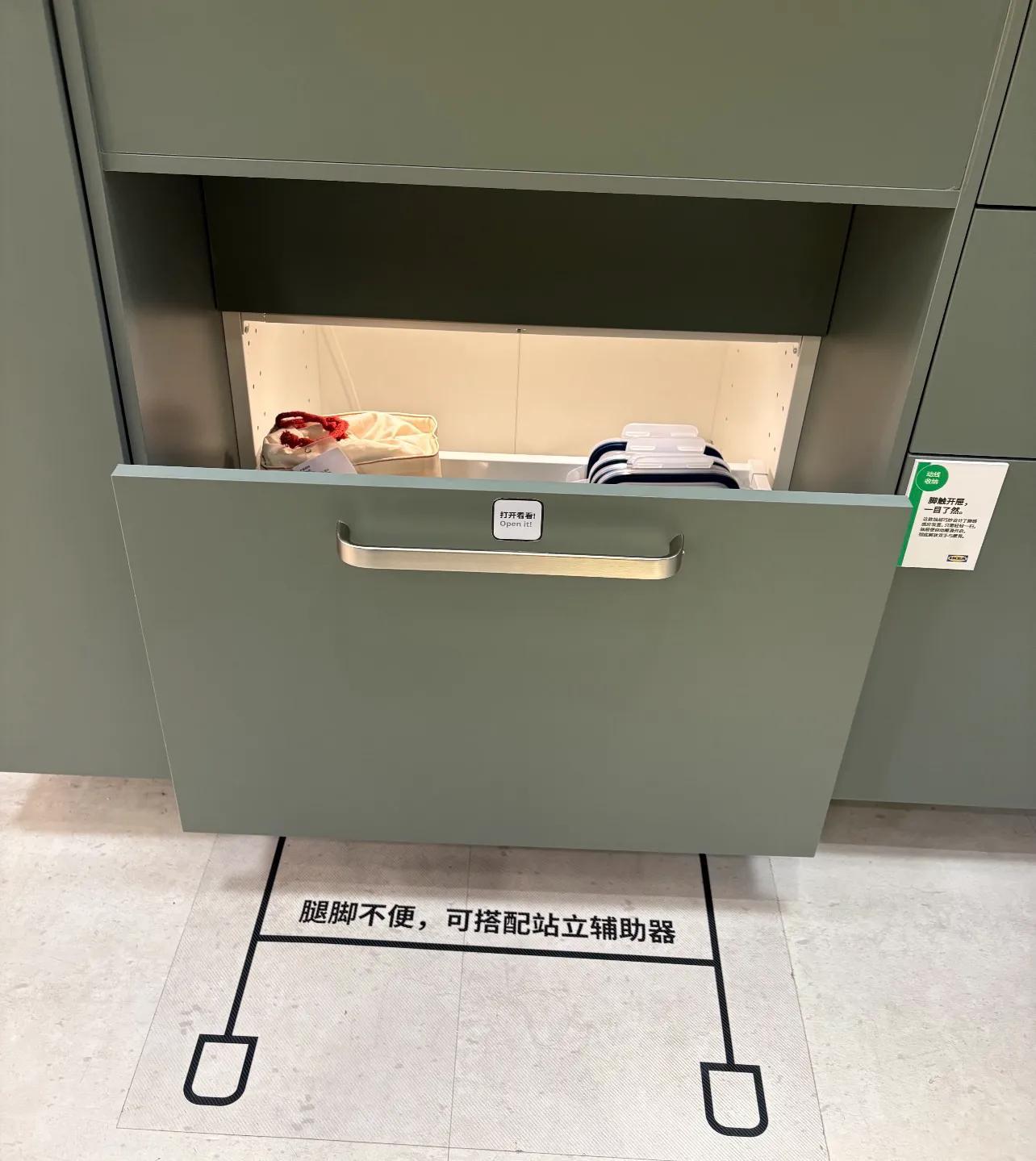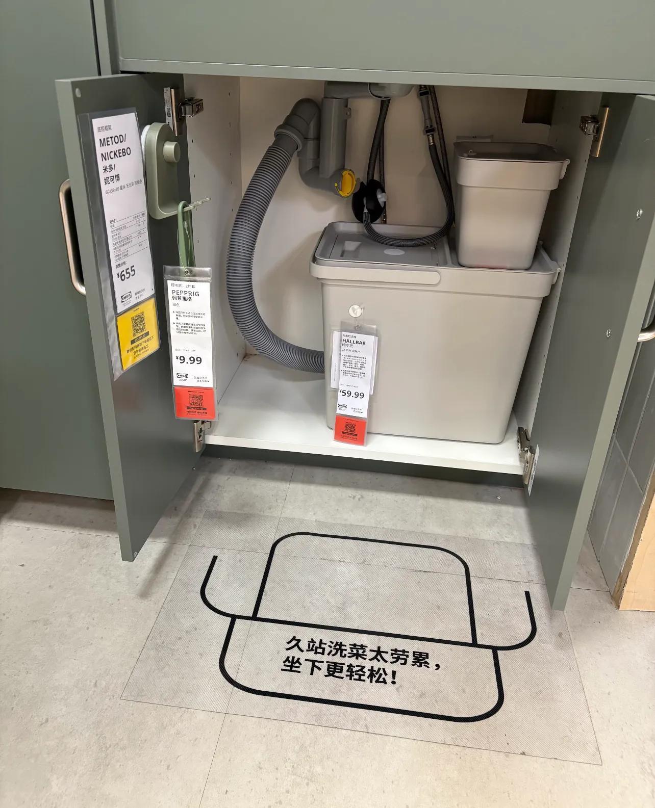 比如這個針對腿腳不便人士的貼紙,在貼心提示的同時,也在暗示宜家擁有可輔助站立的產品。