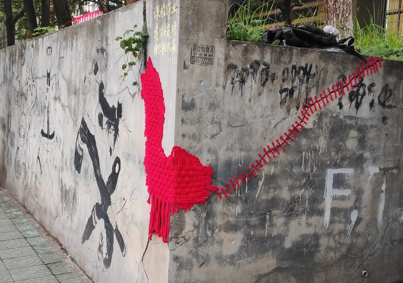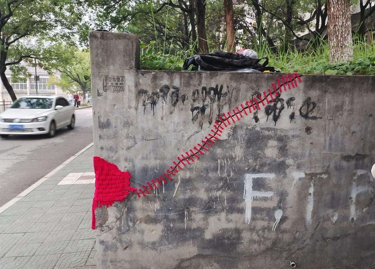 這堵牆,它牆皮缺損的地方,被大面積毛織溫柔地覆蓋,牆體開裂的地方,被用線規律地“縫合”。修補處鮮豔的色彩與牆面雜亂的塗鴉形成顯明對比。