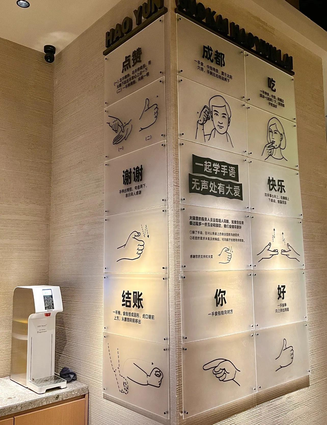一進店,就會看到牆上顯眼的手語學習標識,可以照着手語跟店員進行一些簡單的交流,無聲更勝有聲。