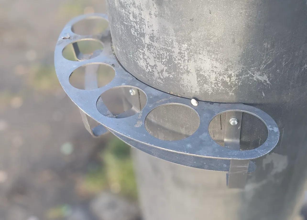 它外層的圈環,是專門用來放置空飲料瓶的。固定在垃圾桶外的圈,直徑相對較大,但也不用擔心小一點的瓶子會掉下去,因爲下面有託兜底。