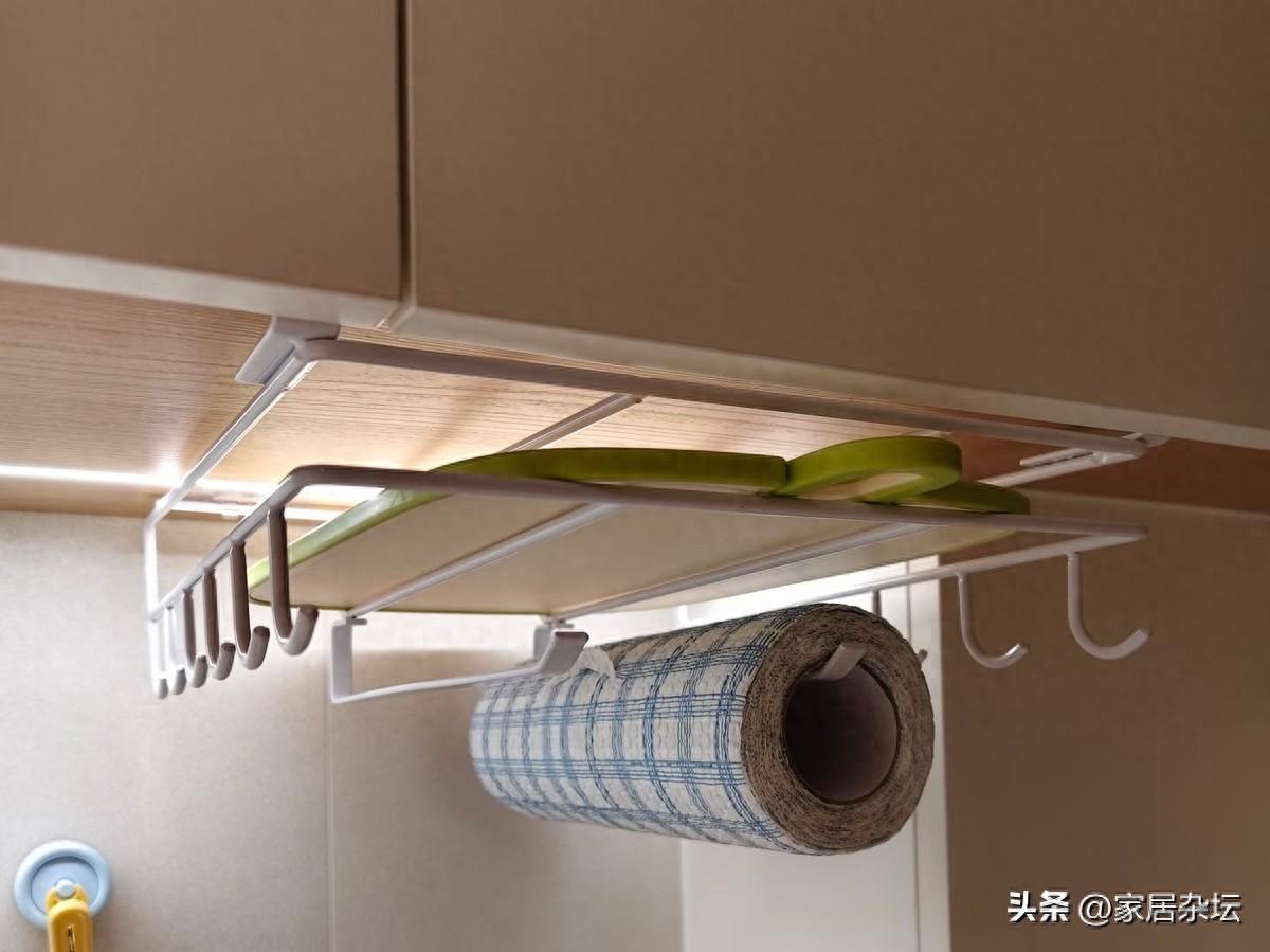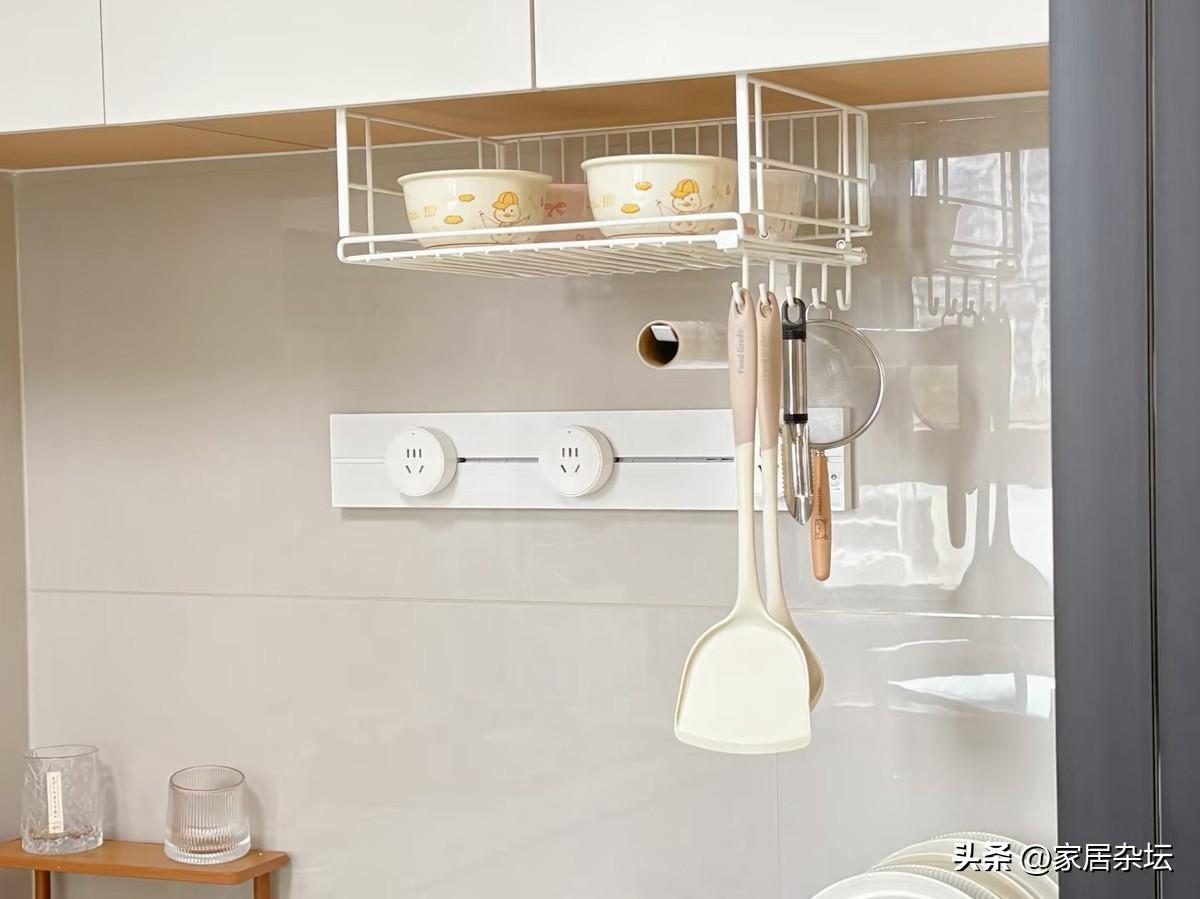 廚房掛籃只需要在櫥櫃的層板下面安裝,懸掛式的收納欄可以掛在層板上,也可以粘在上面。不會佔用檯面的任何空間,而且創造出不錯的收納空間。