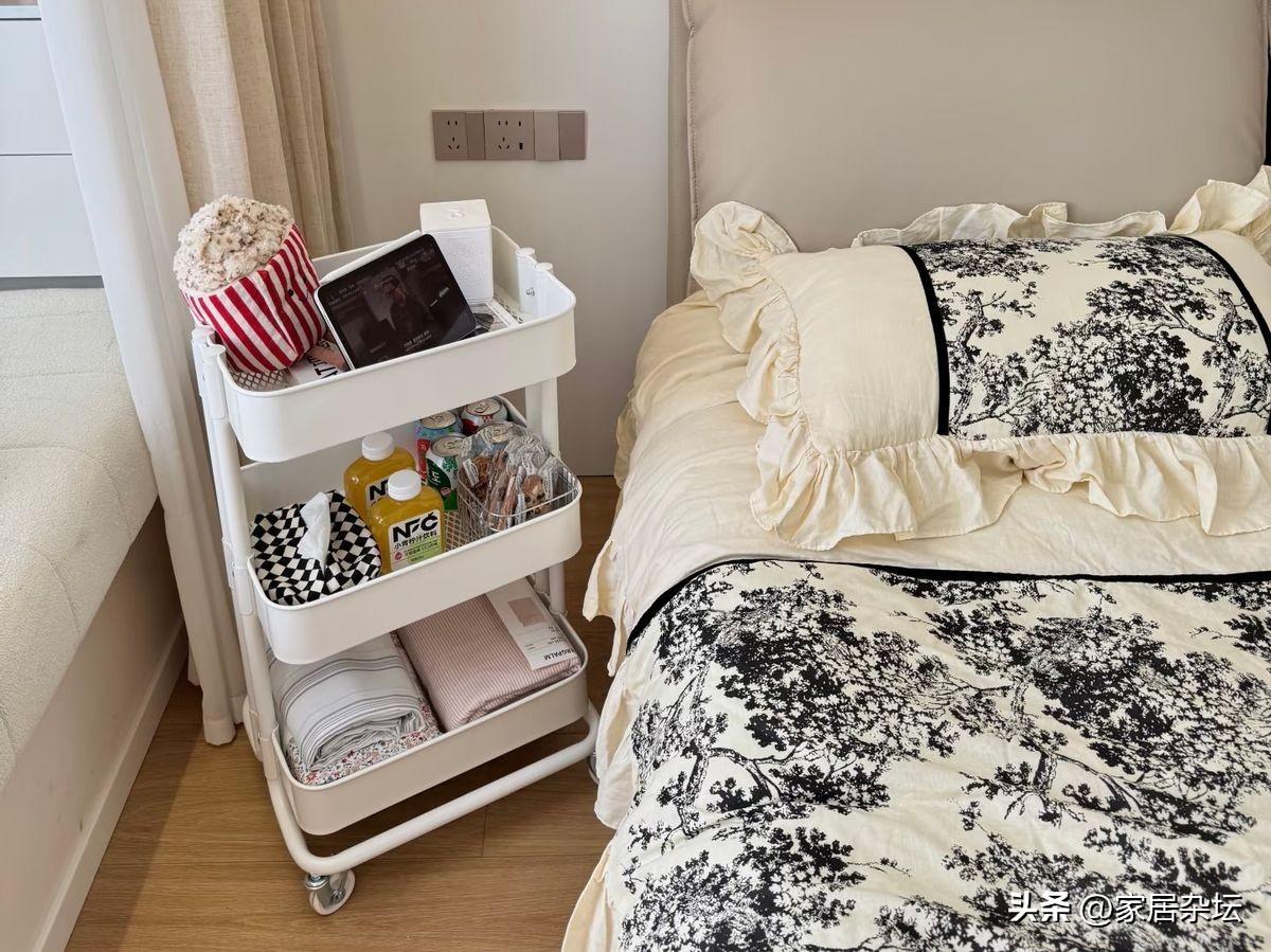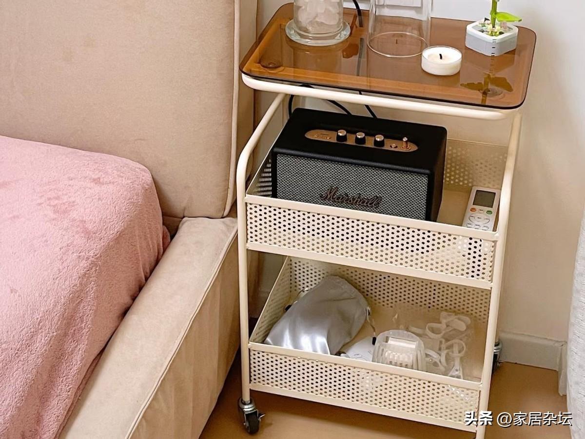 普通家庭可以購買2層或者是3層式的小推車,可以根據不同使用區域分類放置物品。像廚房可以用來放調料和蔬菜水果,牀頭可以用來放平板手機,衛生間又可以用來放洗漱用品,客廳可以放各種零食。