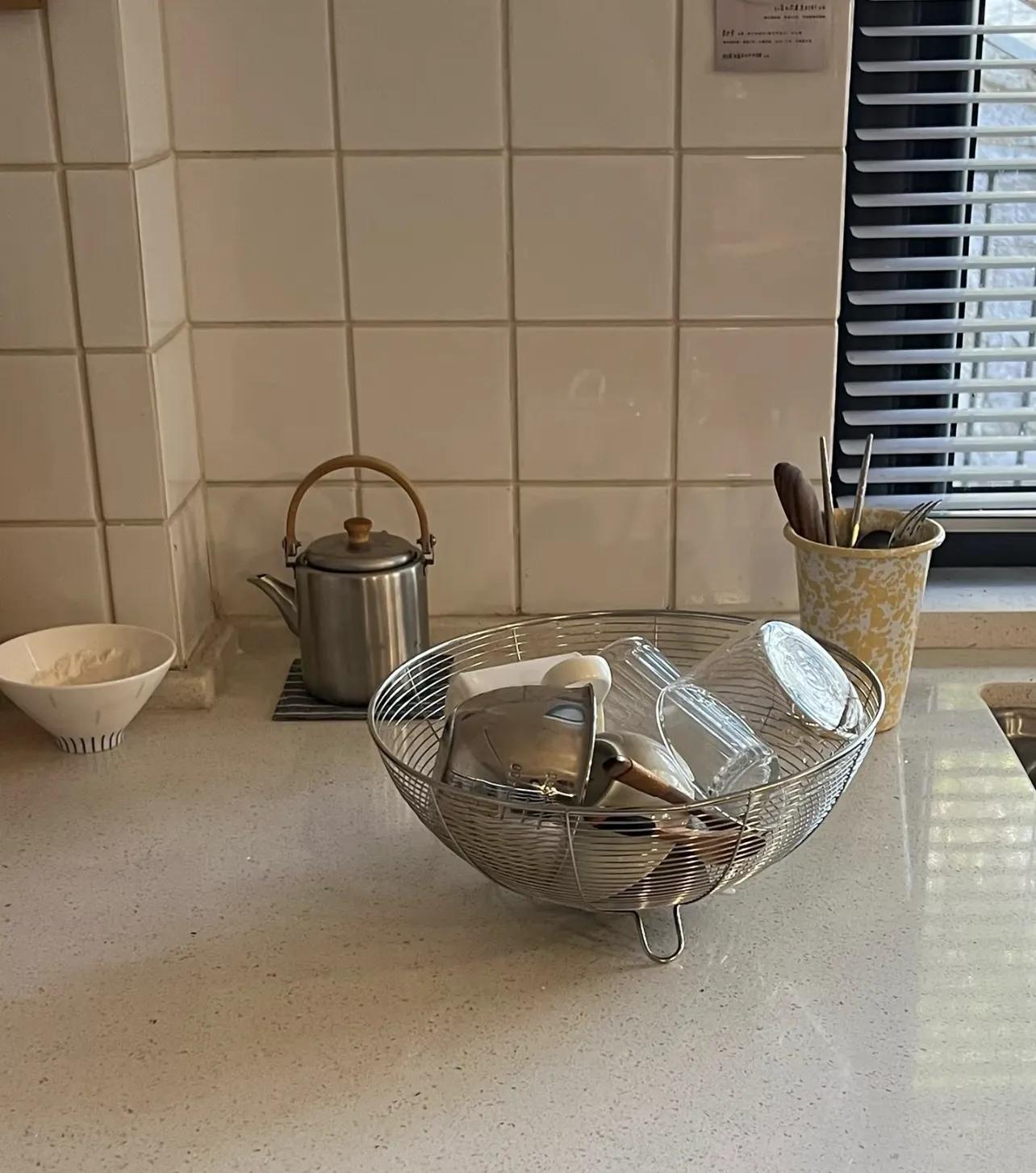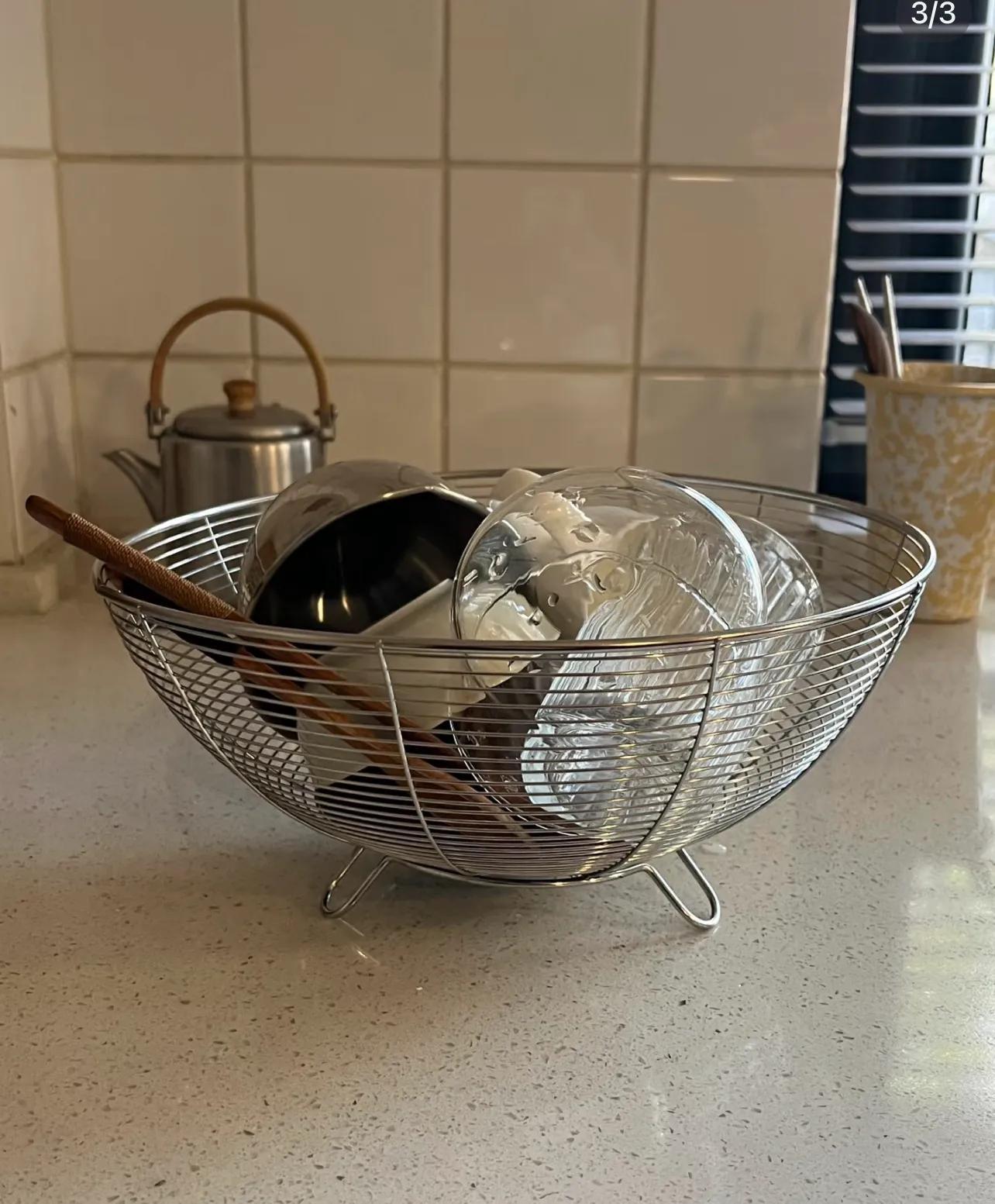 如果是獨居人士,廚房裏的餐具不多的話,它還是個不錯的碗具收納:用完洗乾淨的碗、杯子、筷子什麼的直接丟進去,既省空間,又能瀝乾水分。擺在櫥櫃,隨用隨取,相當方便。