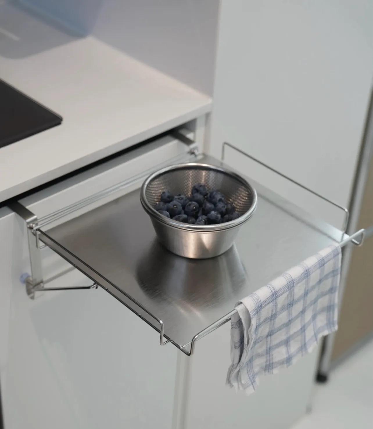用的時候拉起來鋪平,下方卡在下面的掛鉤上,三角形支撐,穩固十足。周圍加裝了護欄,不怕東西掉下去,還可以順便在護欄上掛個抹布什麼的。