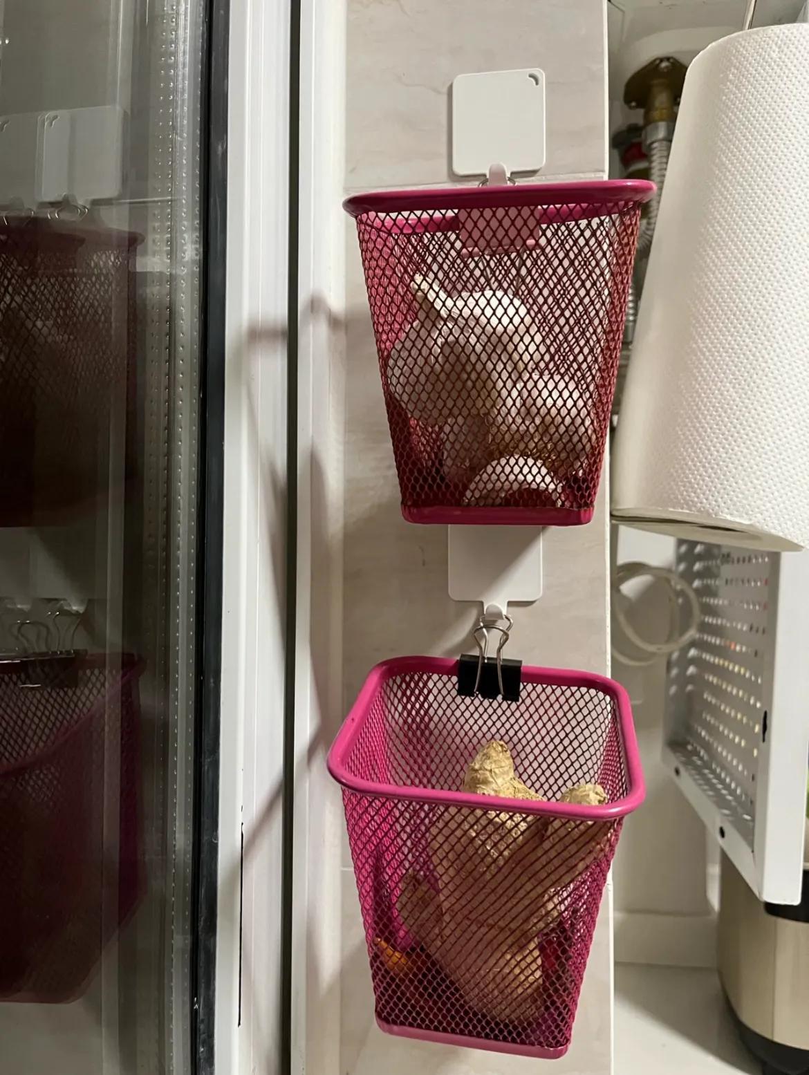 比如這種蔥姜籃,掛到牆上不僅比放到檯面上省地方,而且通風更好,不易發黴。