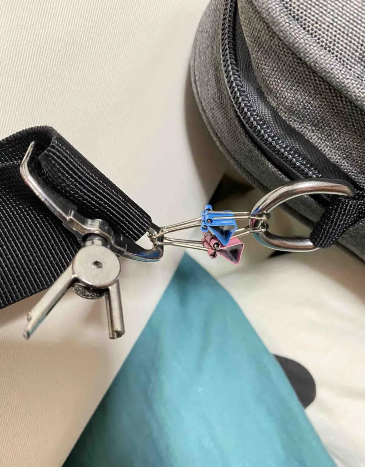 斷了釦子的電腦包,本來還想着買釦子呢,結果用燕尾夾試了下,這筆錢不花也罷!