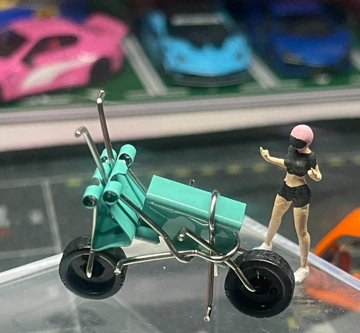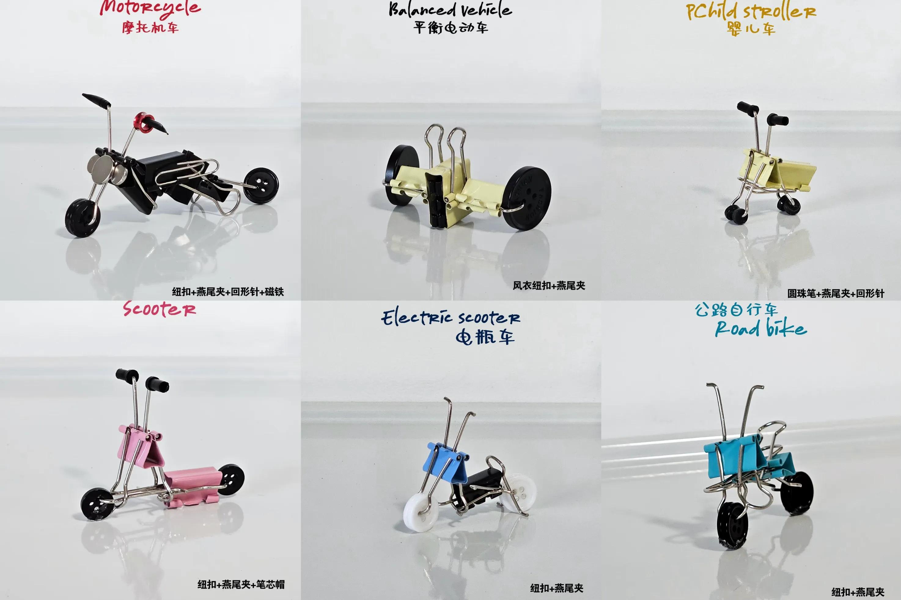 拿出一盒長尾夾,再搭配回形針、紐扣,稍微掰一掰、拼一拼,立馬就能搭出不同款式的“小車”。