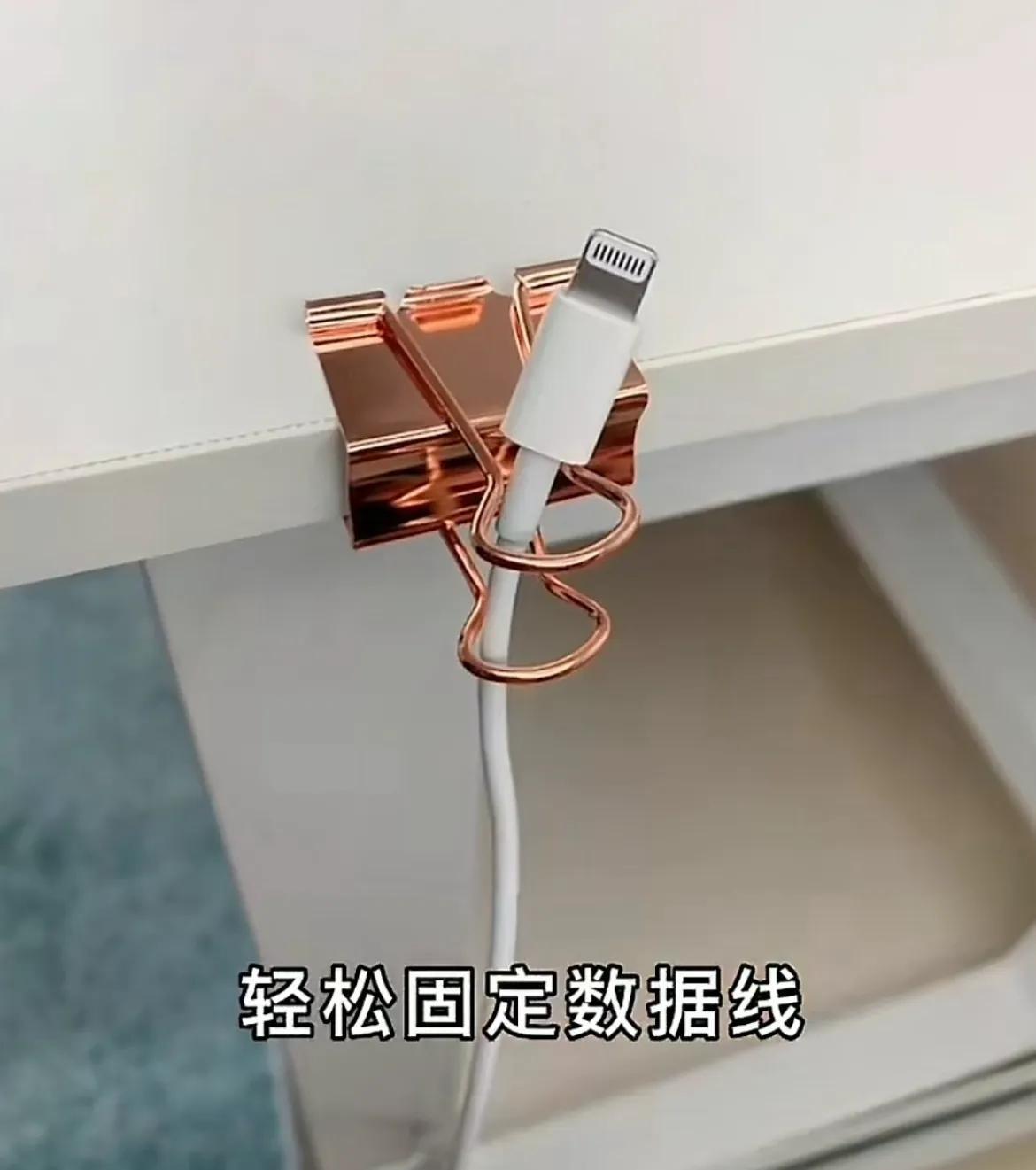 這時,給桌邊夾個燕尾夾,把線穿進去,一拉就出,一放就收,靠重力自動歸位,再也不用彎腰撿。