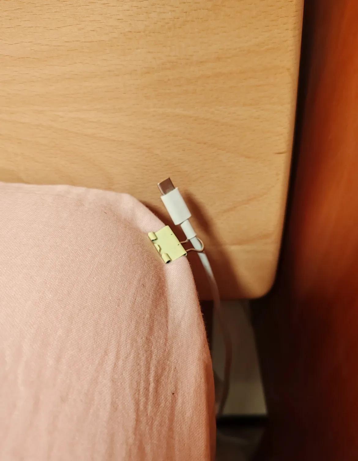 此方法同樣可用於牀邊,夾在牀墊角上,手機充電線隨手一放,隱形又方便。