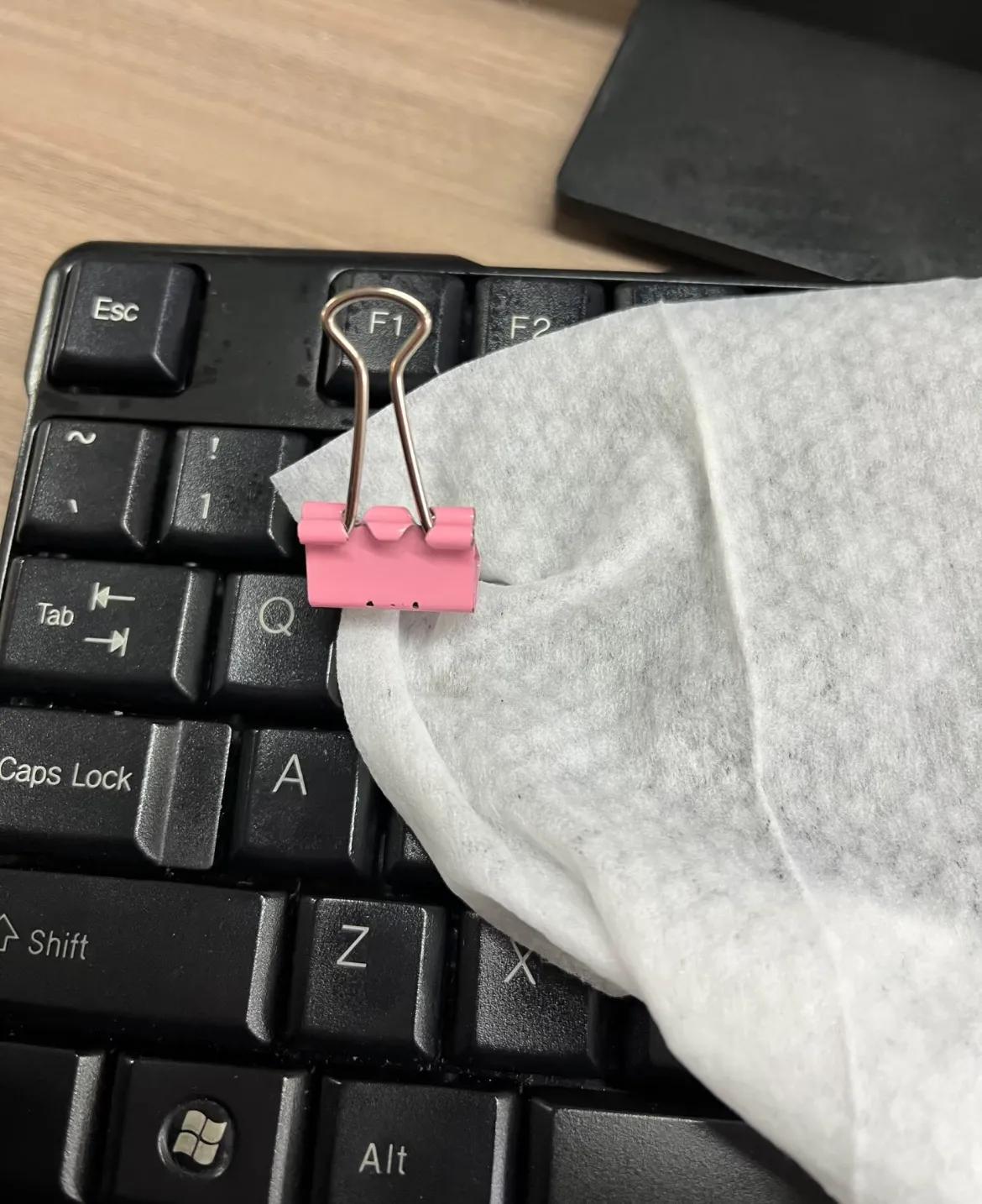 鍵盤縫裏的灰,棉籤摳不乾淨,別灰心,用長尾夾夾一片溼巾,往縫隙裏一推。