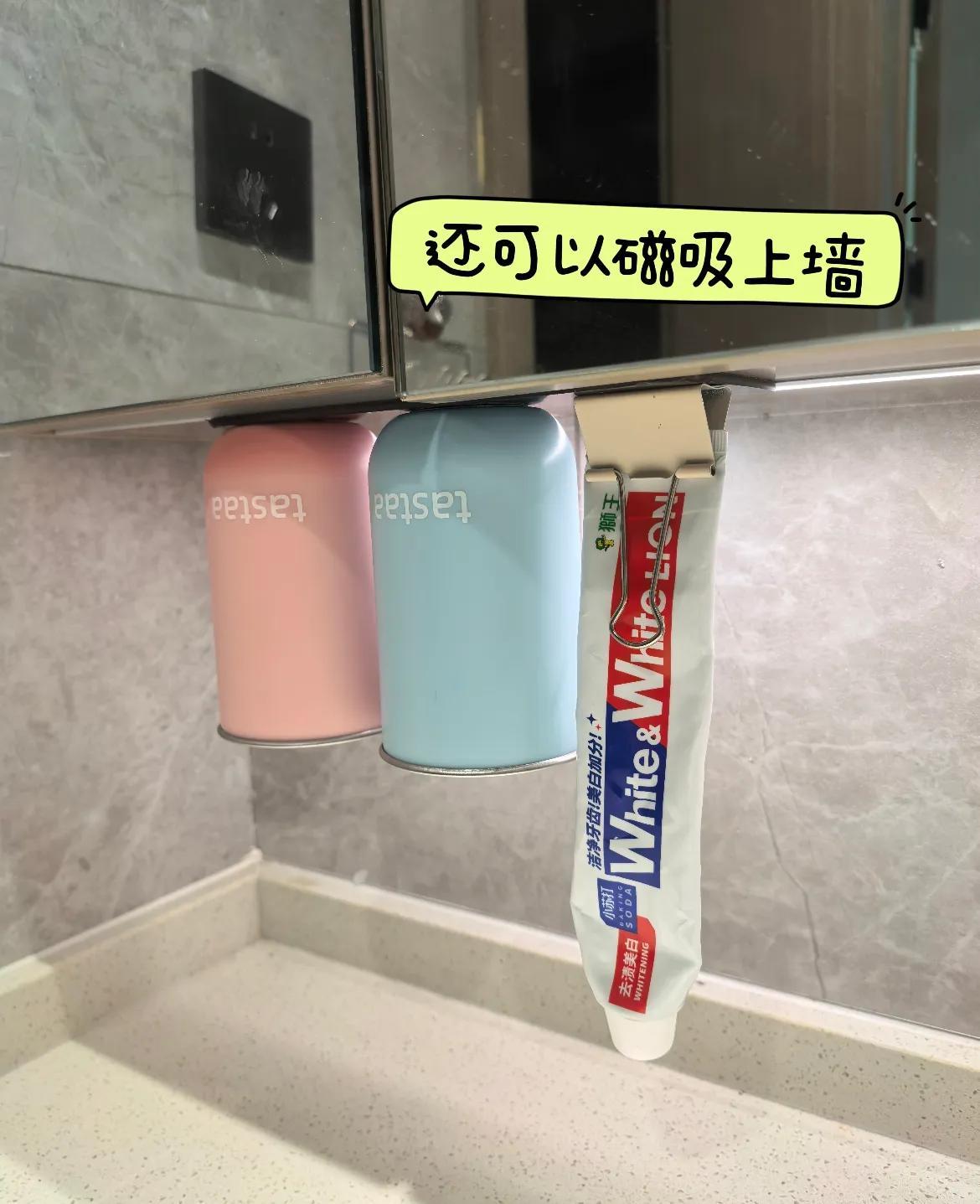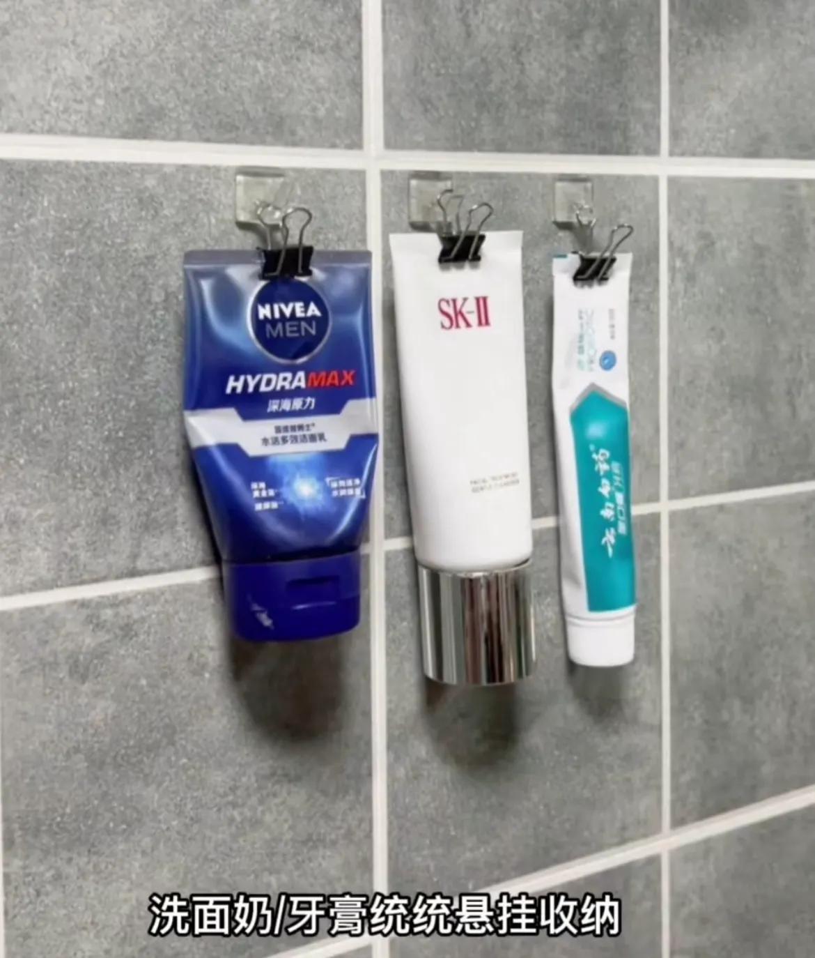 衛生間裏的洗面奶、牙膏,直接放在臺面上溼漉漉的、還有衛生死角的,如果不在意顏值的話,也可以用燕尾夾夾住管尾上牆。